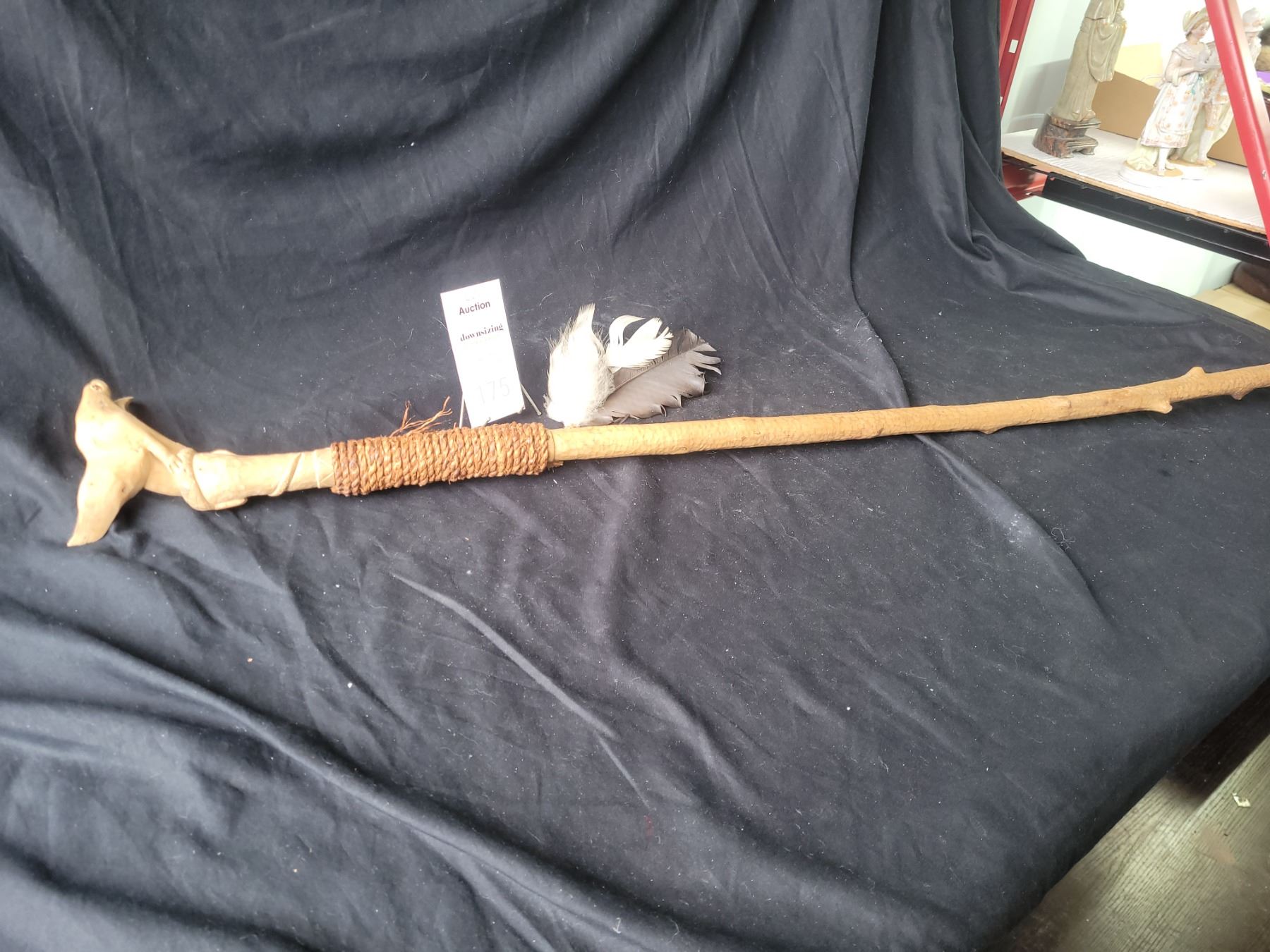 Spread eagle handle, cane has feathers attached. 44" Pickup at 9 am