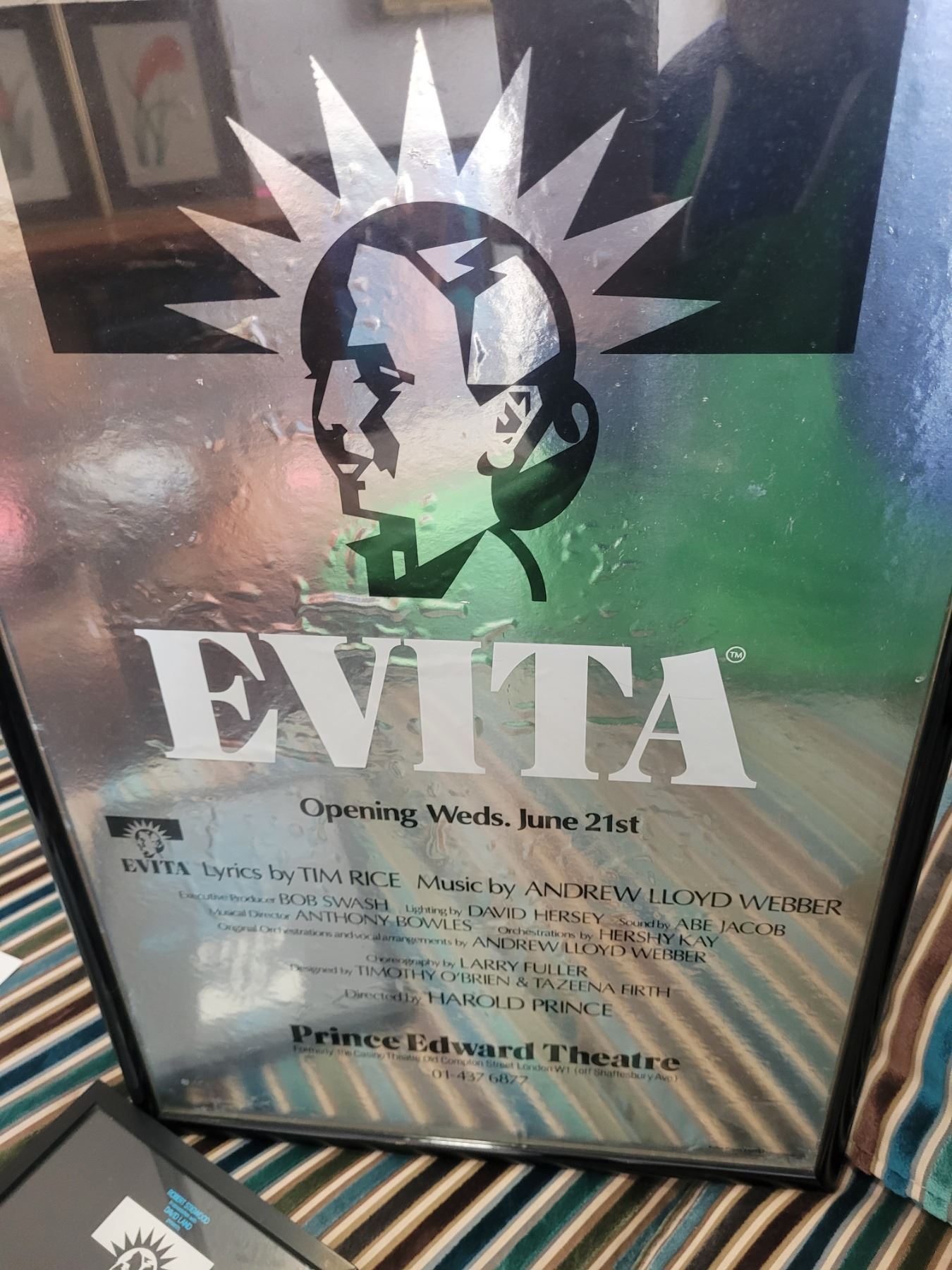 Prince Edward Theatre London UK. Premier opening of Evita Wed June 21st. Smaller framed poster of Evita theatre opening. Pickup at 11 am