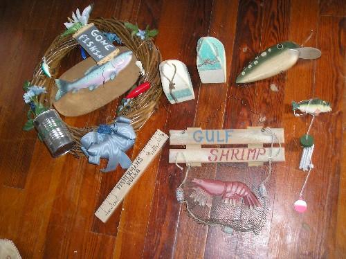 Includes - wreath, shrimp sign, fisherman's ruler, wood floats, chime and large lure. None are old, but cute for decorations.