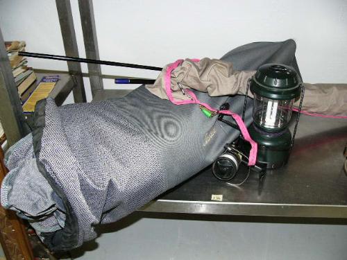 Fishing rod and reel; lantern; MacCabee camping equipment (64)