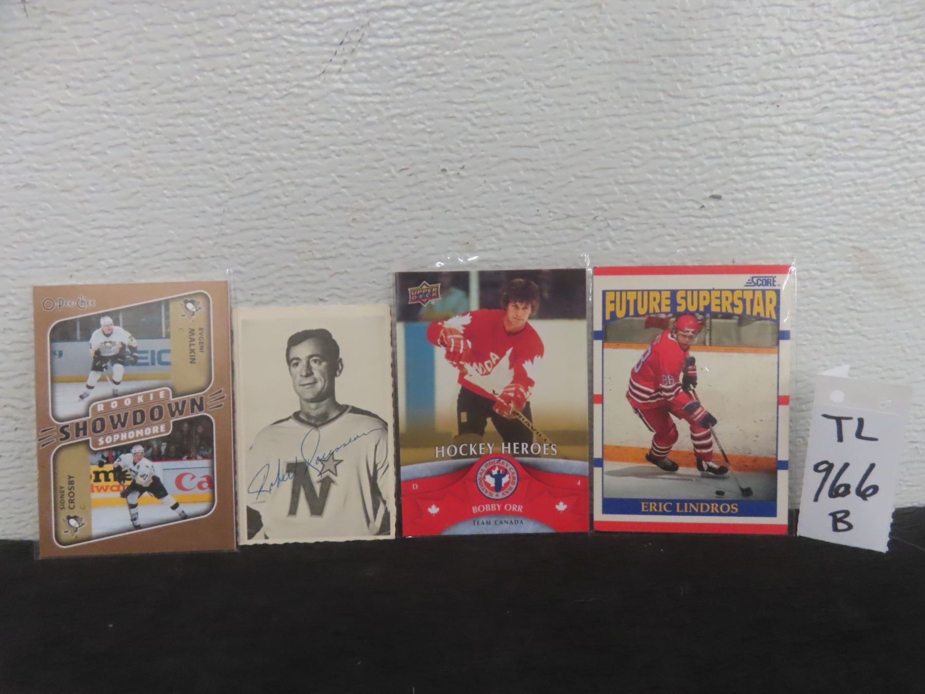 Five Hockey Cards: Eric Lindros Future, Bobby Orr Heroes, Bobby Rousseau, Rookie Showdown Sidney Crosby, and Evgeni Malkin