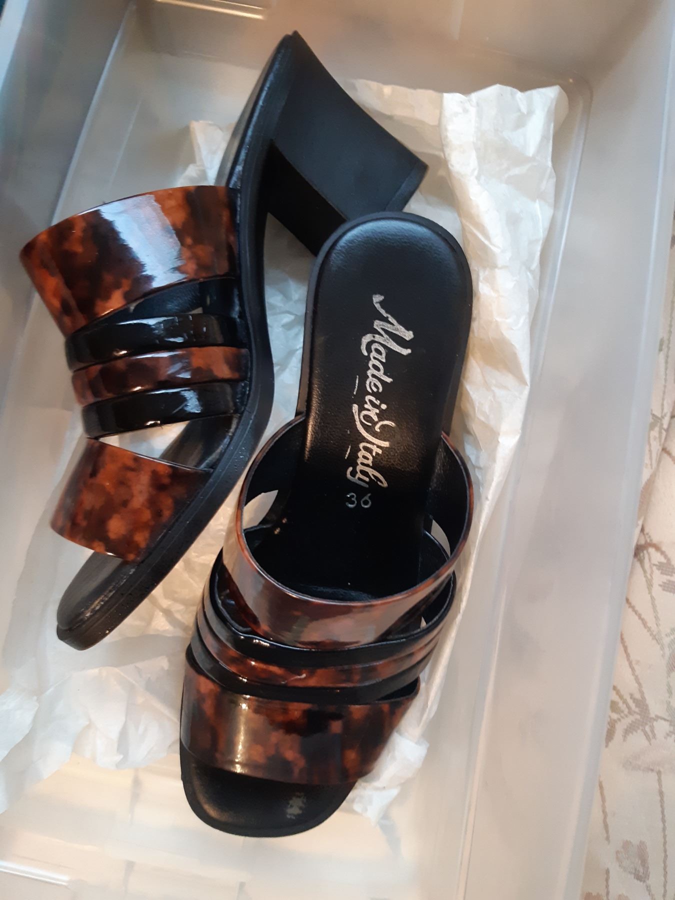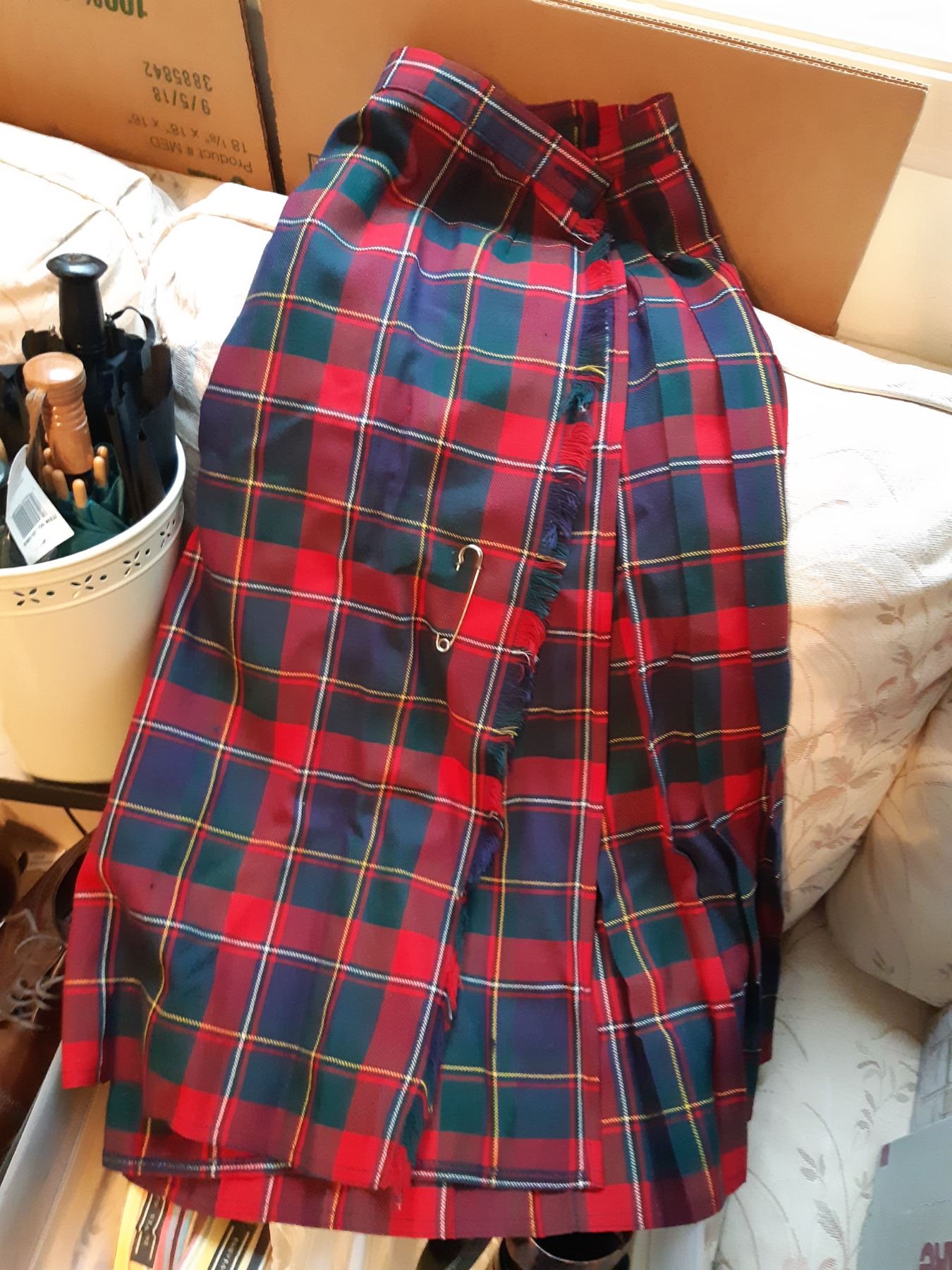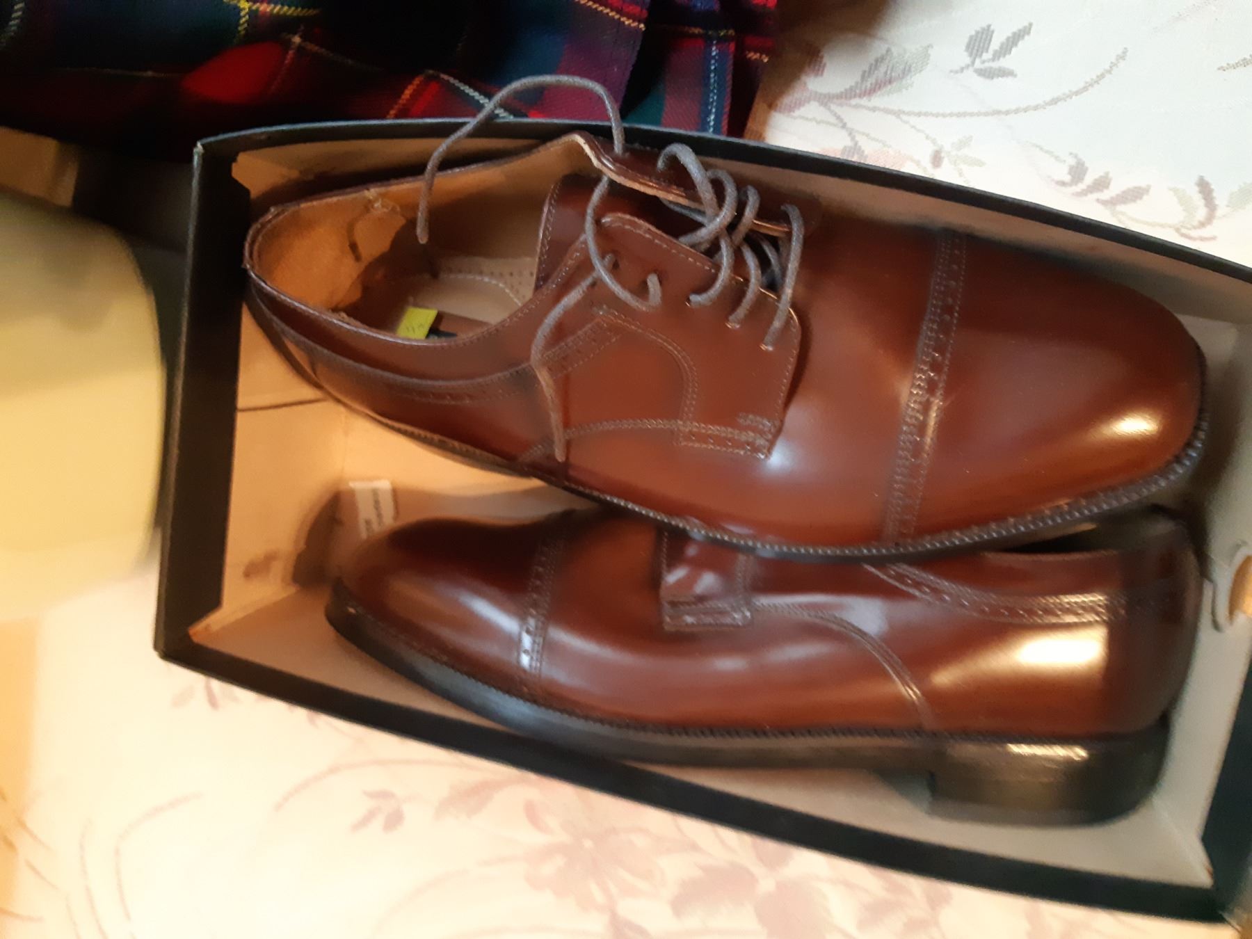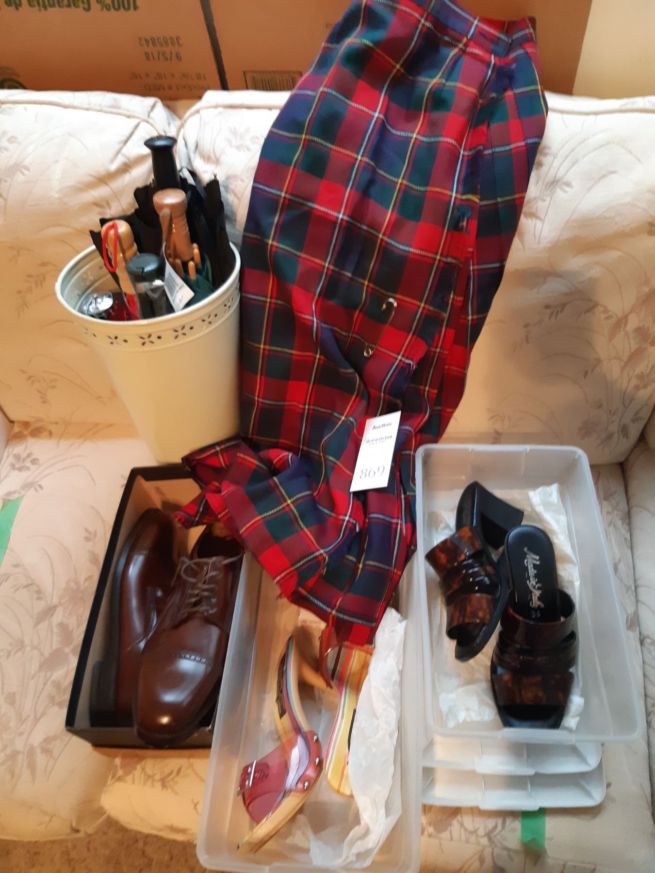 Pair of new mens size 7.5 Florsheim shoes. Ladies slip on shoes sizes 5 and 7. Kilt like wrap round skirt size 12 and umbrellas. Pickup at 9 am