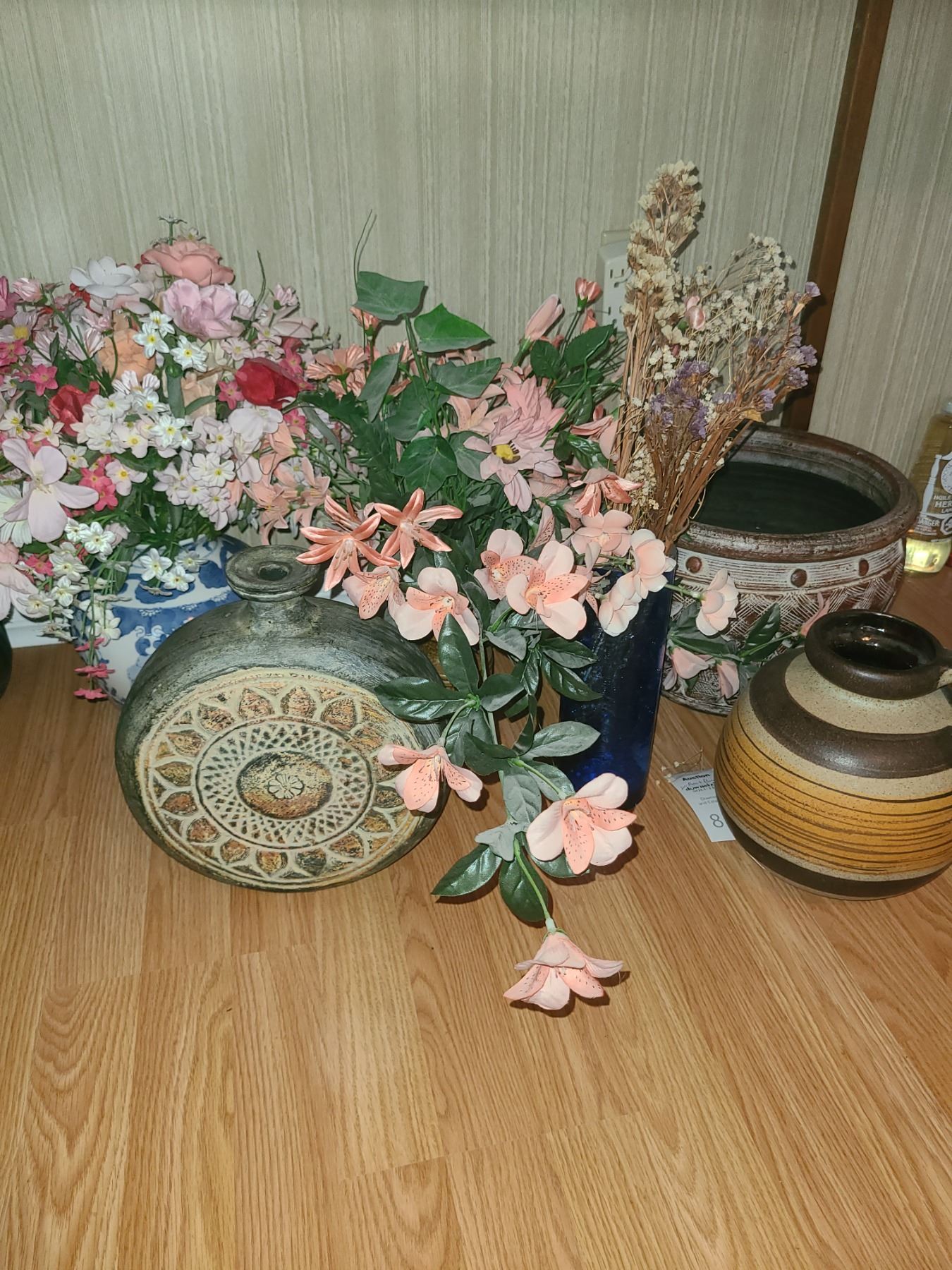 Lot of flowers and decorative vases. Bring box to carry away. Pickup at 9am.