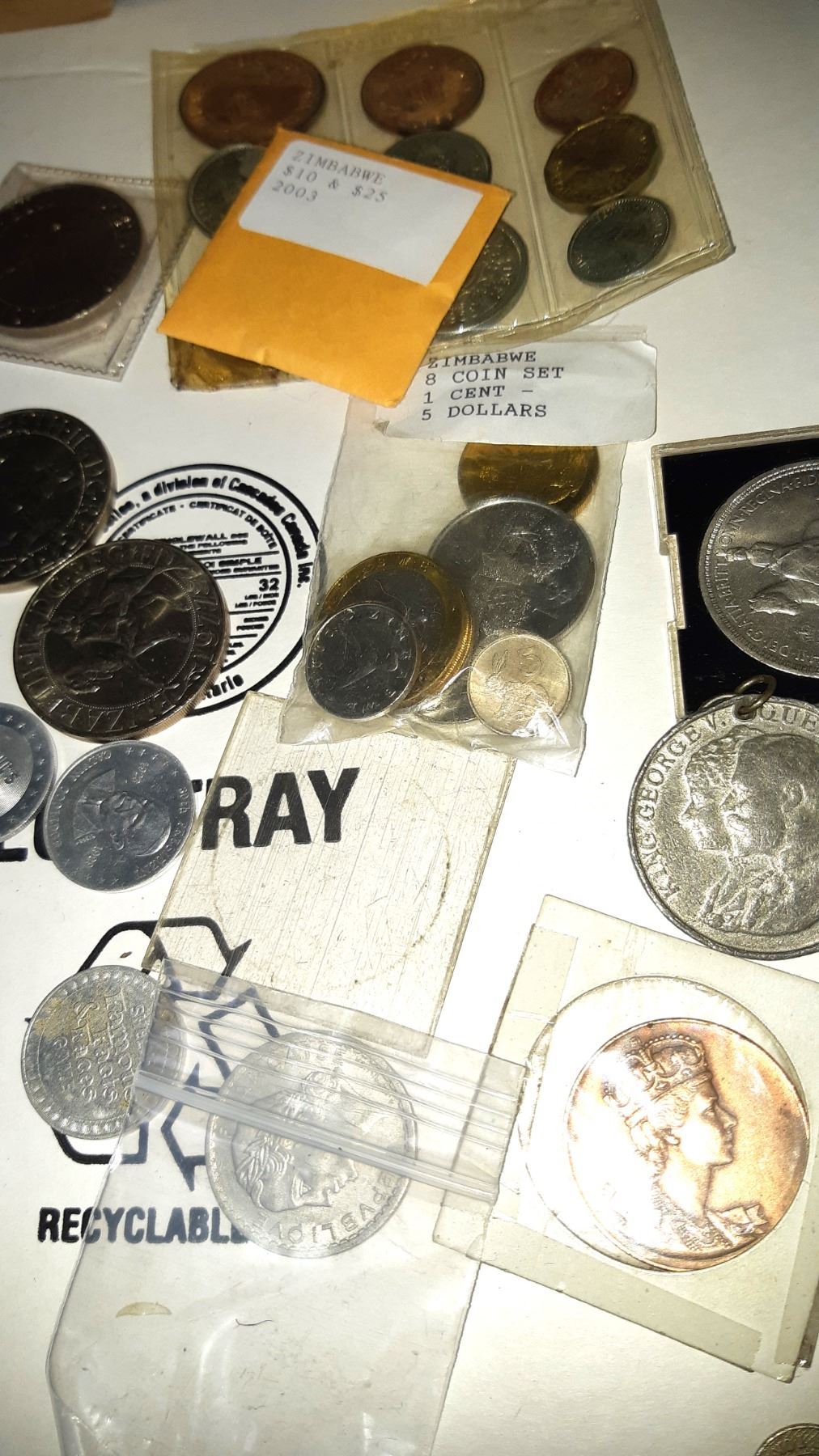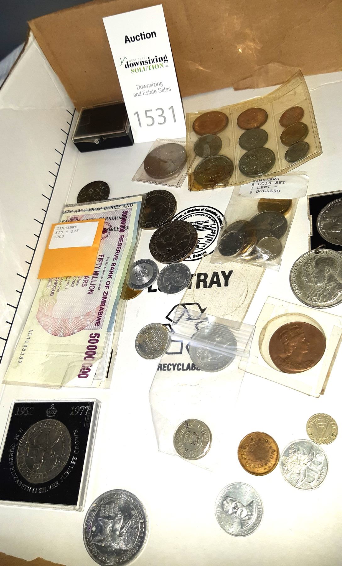 Assortment of foreign paper & coin currency. Pickup at 9 am