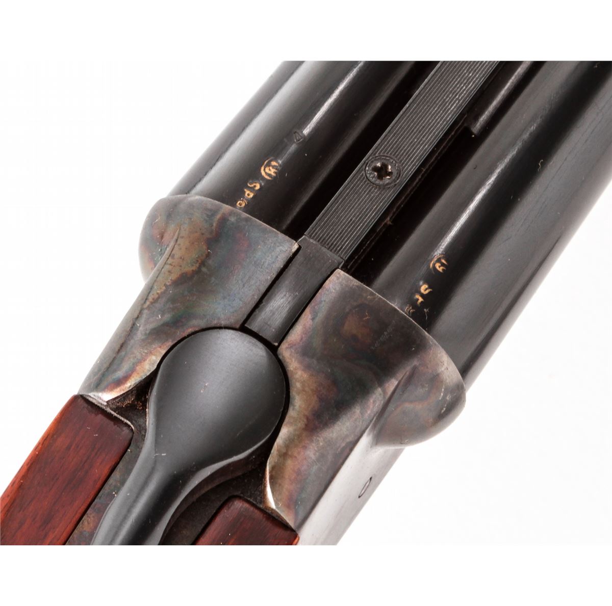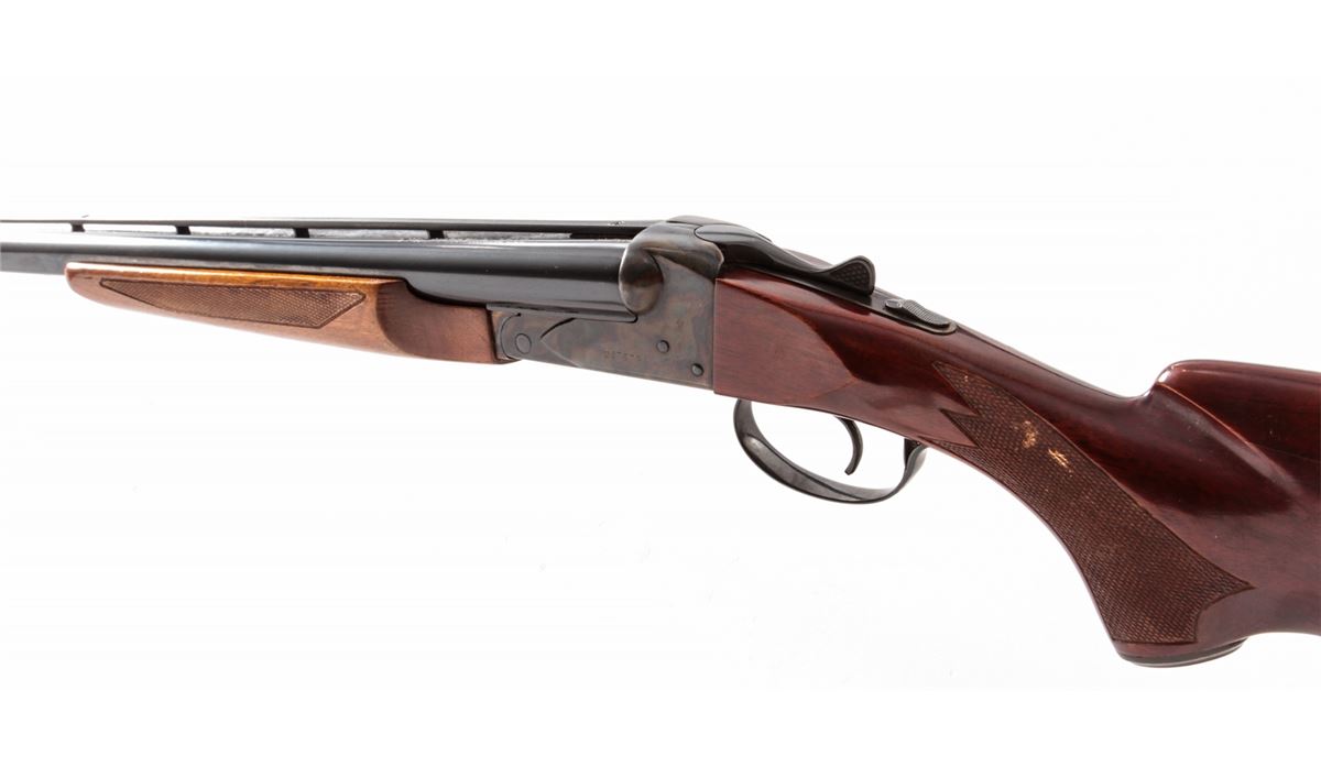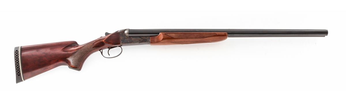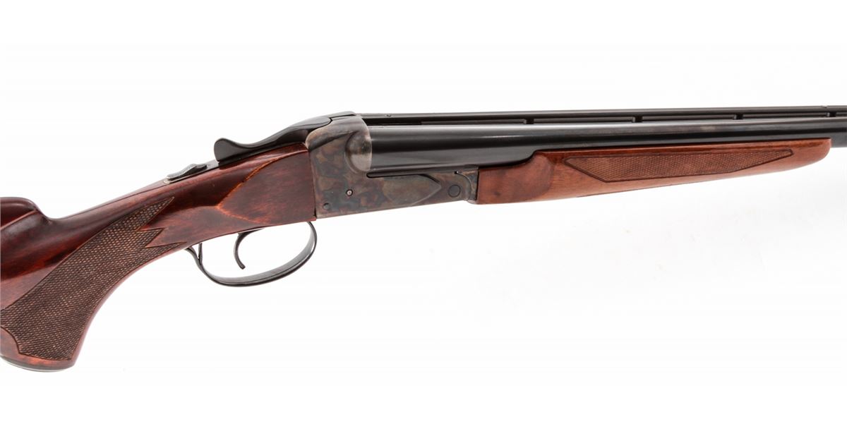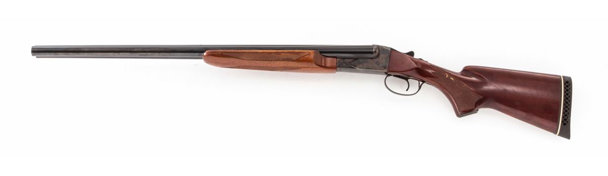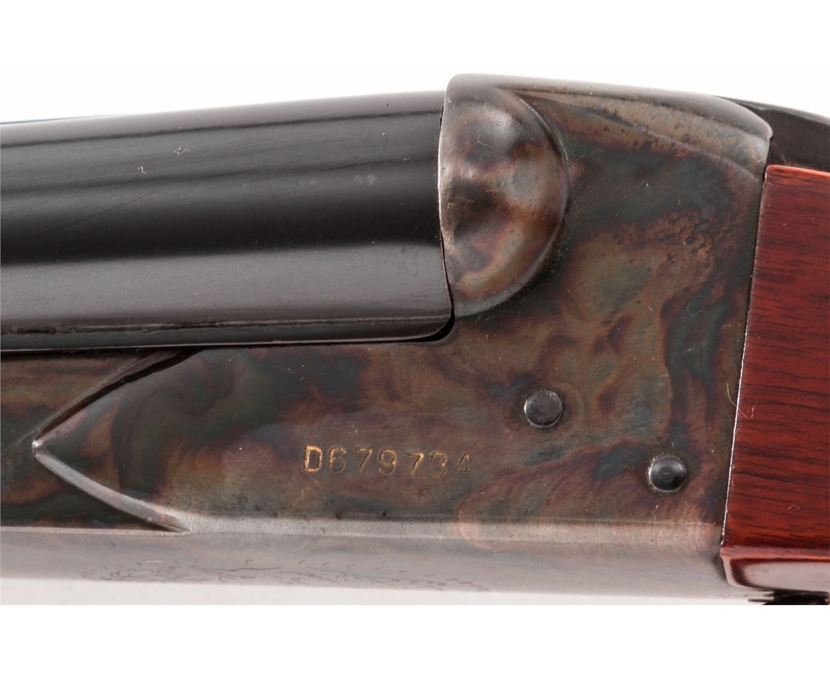Fox Model BSE Series H Side-by-Side Shotgun, #D679734, 12 ga., 26'' vent rib compensated shortened barrels, blue and case hardened finish, checkered hardwood stock. Condition is fine as modified, missing both front and central bead. Approx. 95% finish remains. Minor impressions to buttstock, which is a somewhat darkened color than the forend. Crisp action, bright bores. Est.: $250-$450. (C&R)