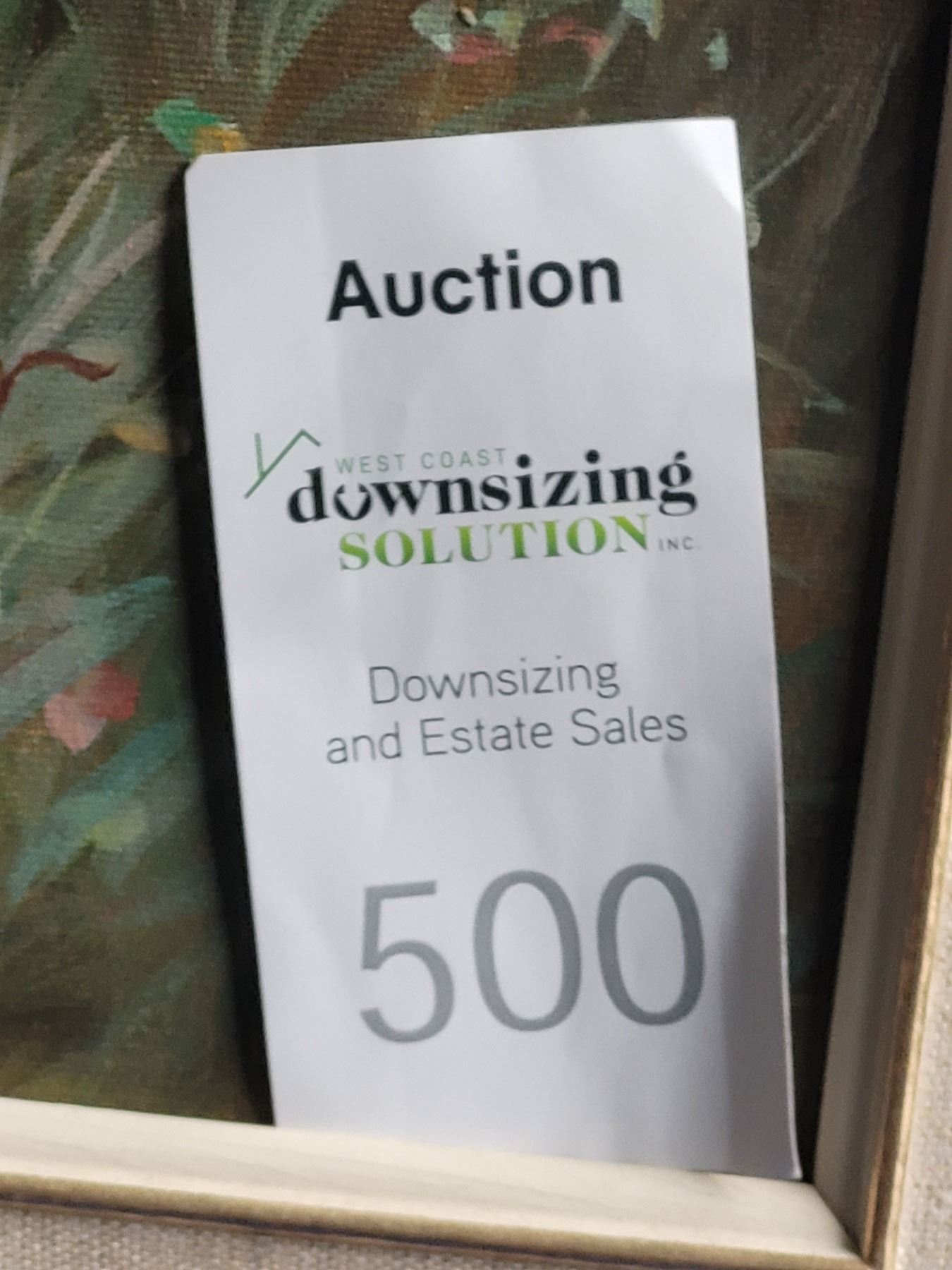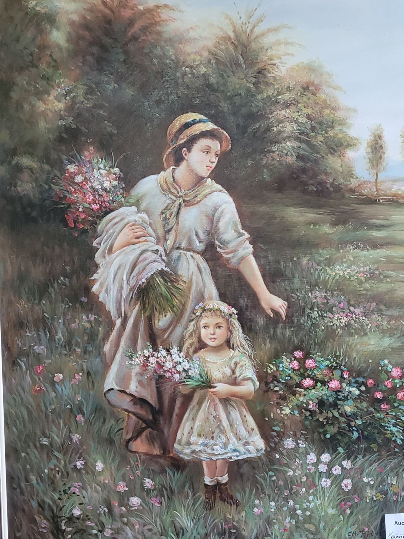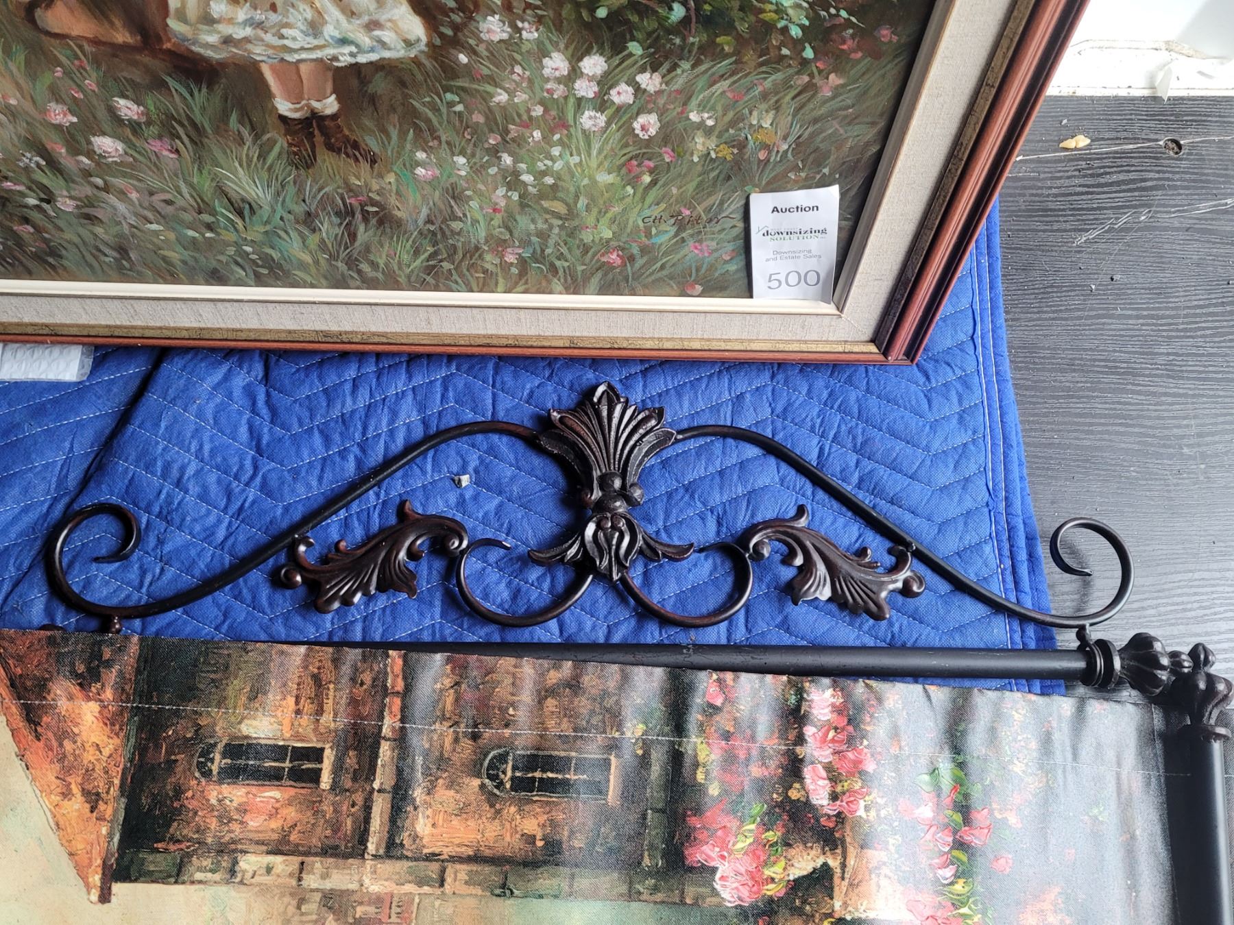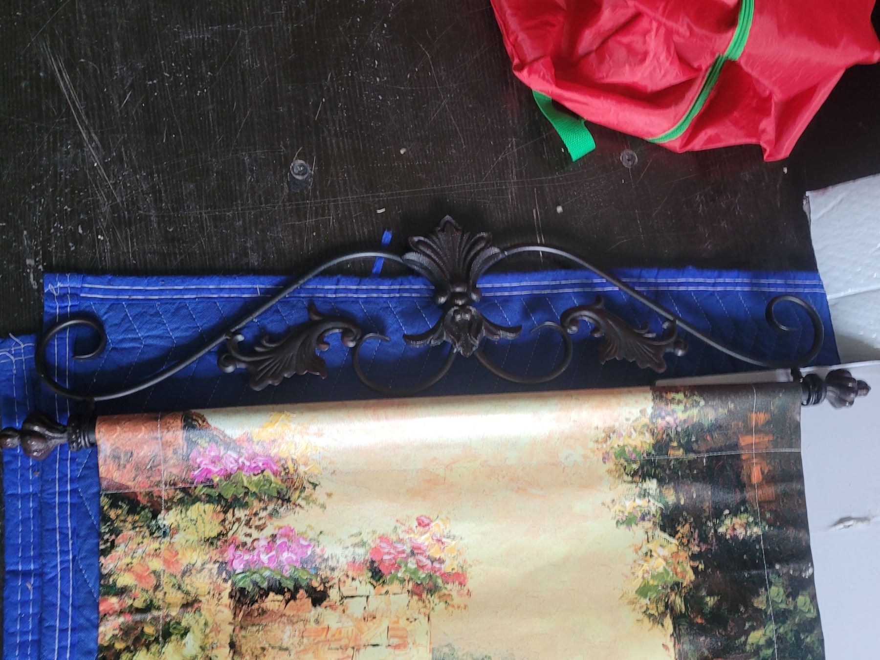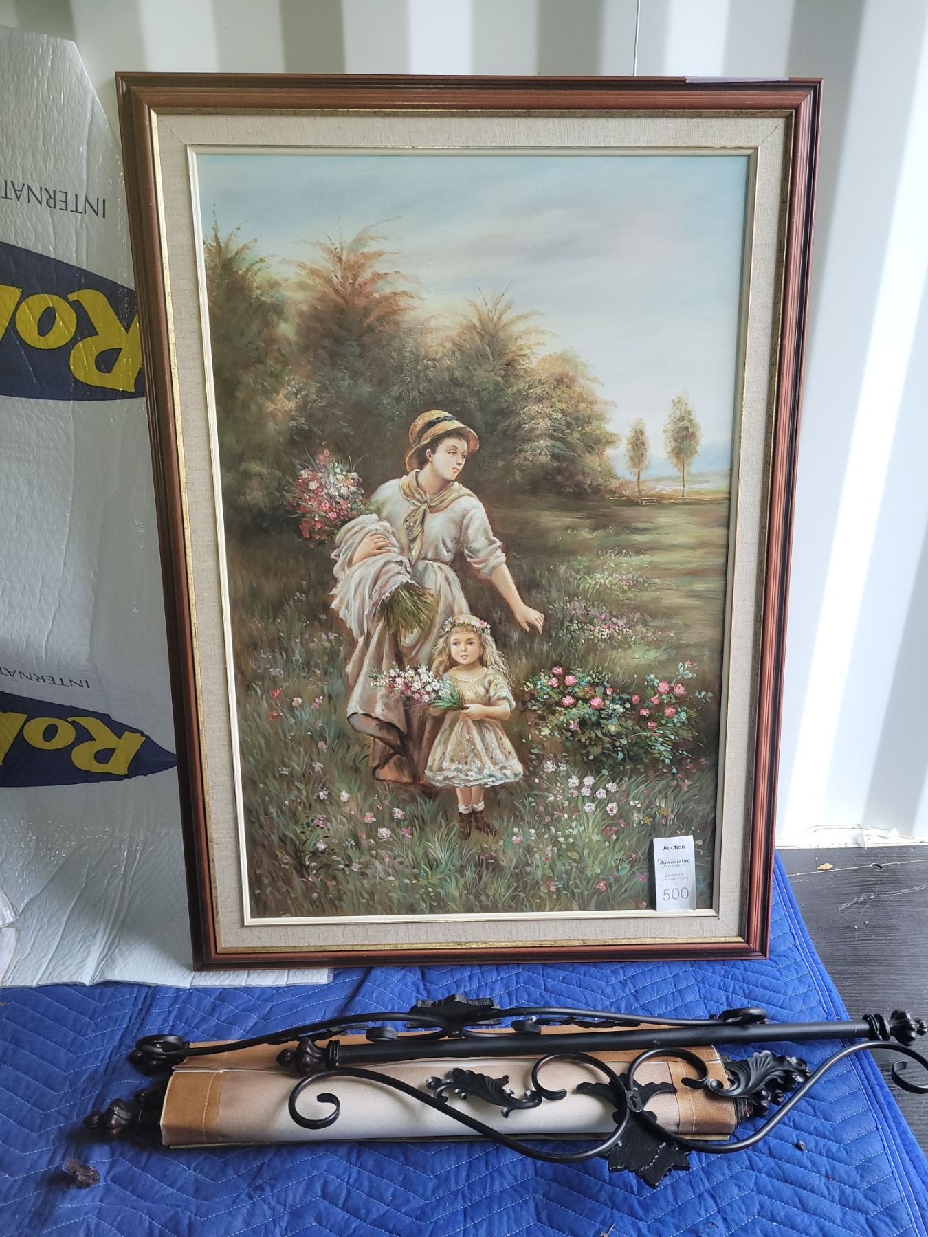 Large framed original art by CH Pitor 30x48. 2 roll up painted canvas with ornate metal wall hangers. Pickup at 9 am