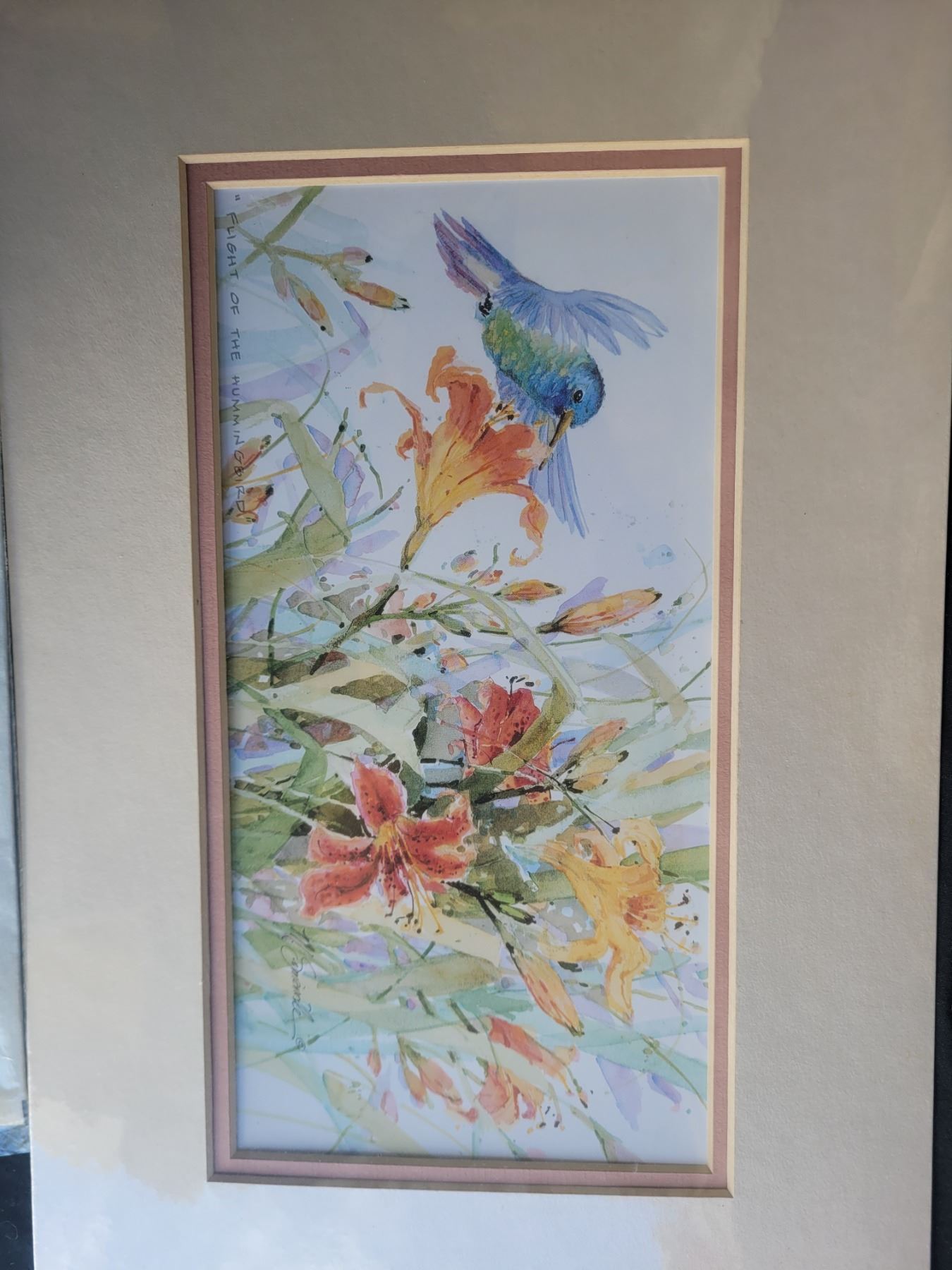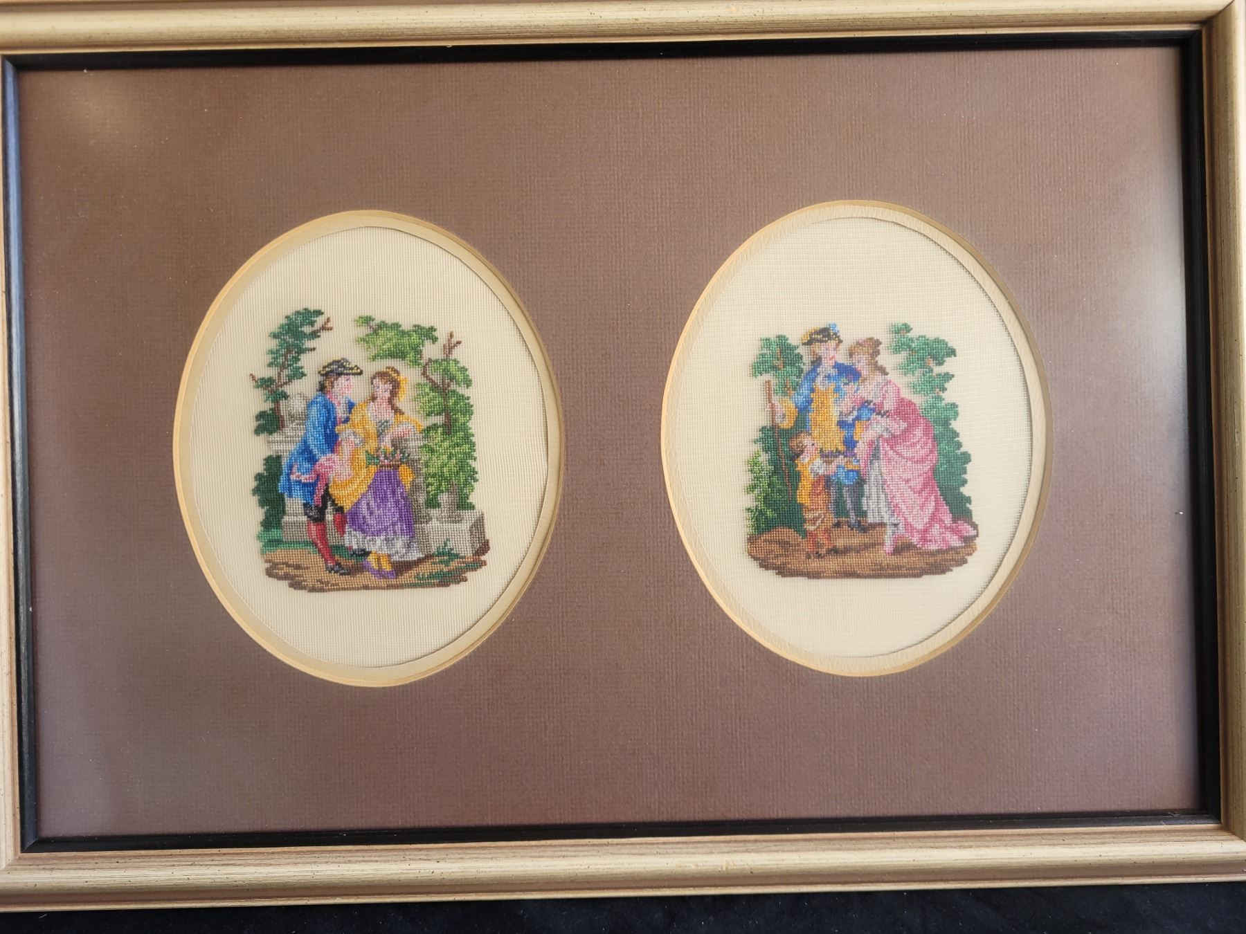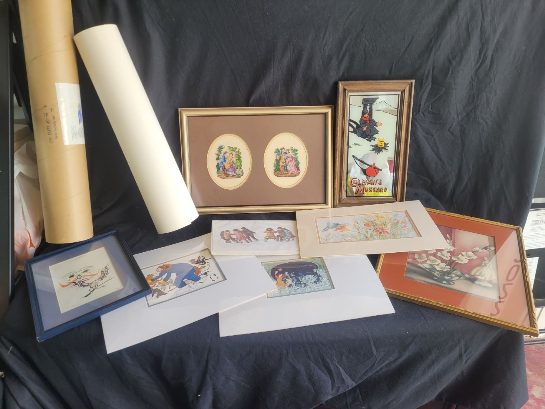 Framed needle point 17x12. Assortment of framed and unframed art. Pickup at 9 am