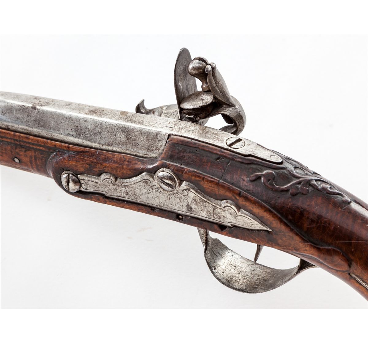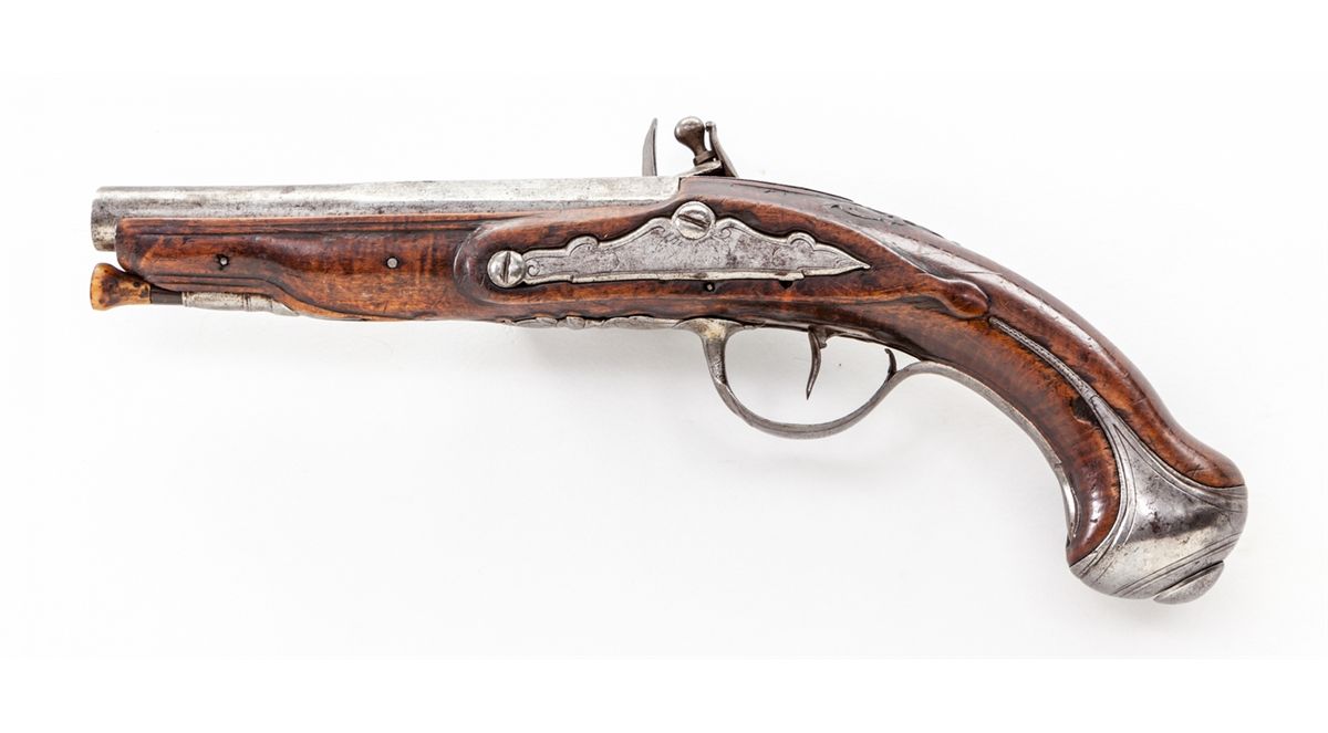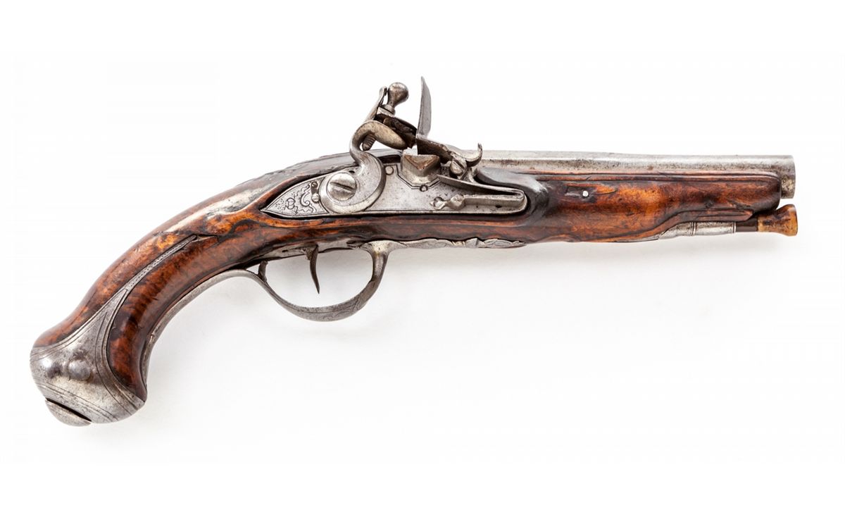 French Flintlock Officer's Pistol, unmarked, .58 cal. smoothbore, 6'' barrel, bright iron metalwork, lightly engraved lock and hammer, nicely carved fruitwood stock, with cock turnscrew as pommel cap. Condition is fine with light even carbon spotting to metal surfaces. Some stock detail lost from time and handling. Good functioning lock. Horn-tipped rosewood rammer is present. Est.: $1,800-$2,400. (Antique)