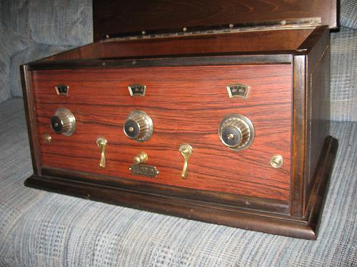 By this time more stylish and easier to use 2-dial and early 1-dial sets were beginning to dominate the market. By using more modern looking vernier dials, and very aggressive pricing, Freshman was able to sell a few more of the now out of date Masterpieces. This set appears to be complete and in very good condition. Sold without tubes.