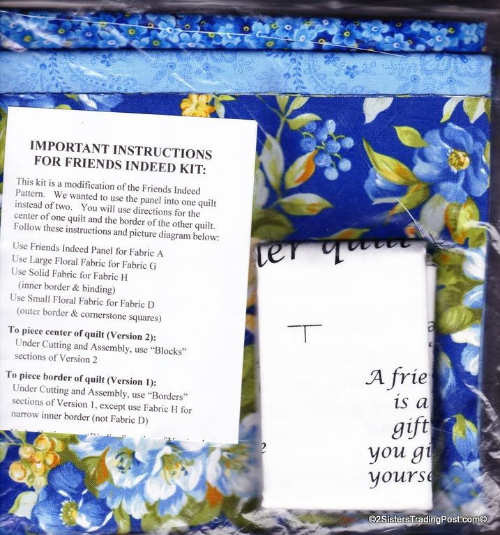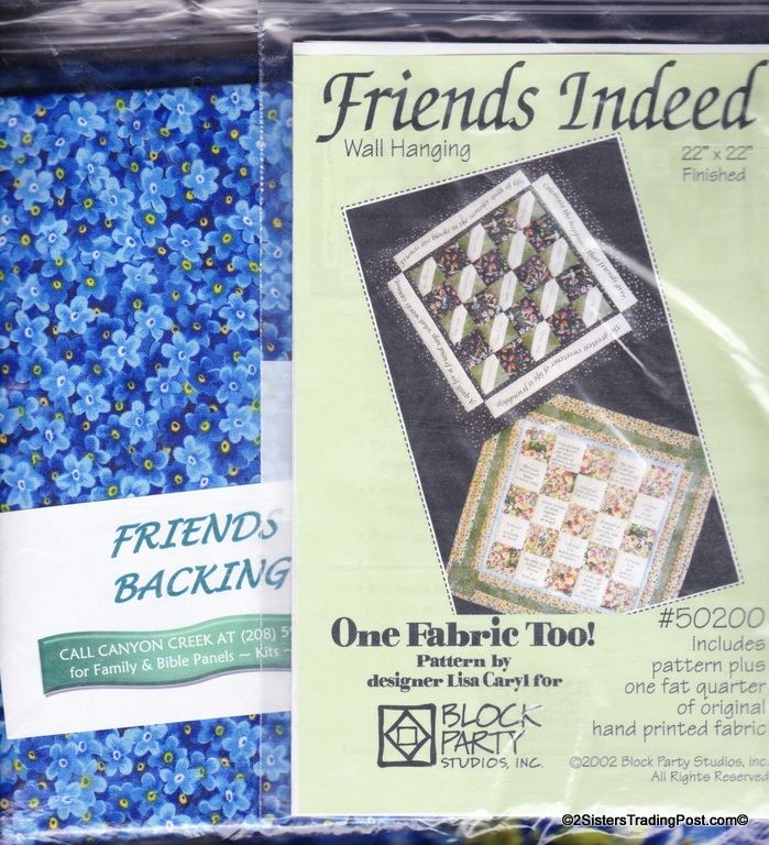 Friends Indeed' Panel kit for wall hanging. Included is the friends panel, pattern and all fabric to finish the top, bindings and backing. Finished wall hanging measures 22" x 22". NOTE: Batting IS NOT included MSRP for fabric $39.98