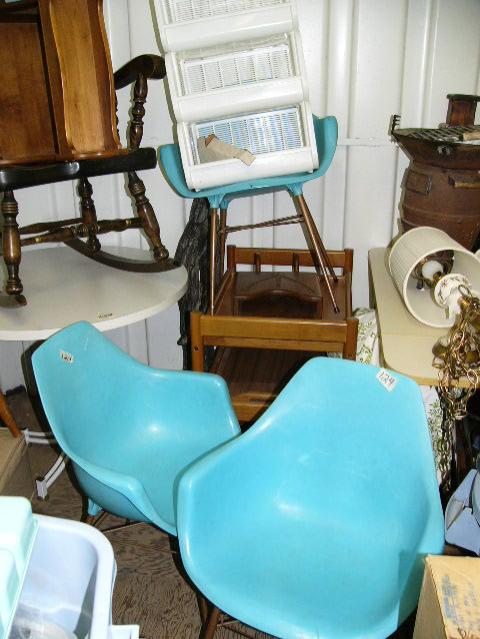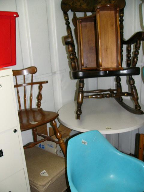 Furniture: rocking chair, round table, 1960's blue chairs, VHS tapes, VHS tape holder, various household items (81)