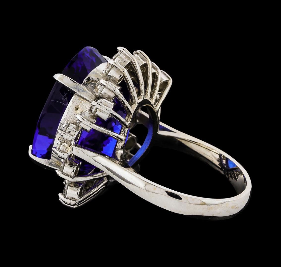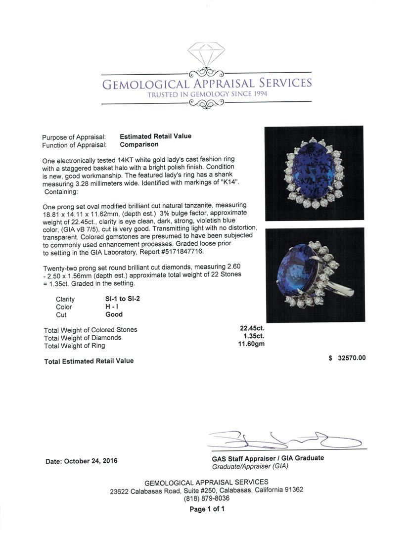 One electronically tested 14KT white gold lady's cast fashion ring with a staggered basket halo with a bright polish finish. The featured lady's ring has a shank measuring 3.28 millimeters wide. Identified with markings of 'K14'. Condition is new, good workmanship. Containing: One prong set oval modified brilliant cut natural tanzanite, measuring 18.81 x 14.11 x 11.62mm, (depth est.) 3%. bulge factor, approximate weight of 22.45ct., clarity is eye clean, dark, strong, violetish blue color, (GIA vB 7/5), cut is very good. Transmitting light with no distortion, transparent. Colored gemstones are presumed to have been subjected to commonly used enhancement processes. Graded loose prior to setting in the GIA Laboratory, Report #5171847716. Twenty-Two prong set round brilliant cut diamonds, measuring 2.60 - 2.50 x 1.56mm (depth est.) approximate total weight of 22 Stones = 1.35ct. Graded in the setting. Clarity SI-1 to SI-2. Color: H - I Cut Good. Total Weight of Colored Stones 22.45ct.. Total Weight of Diamonds 1.35ct.. Total Weight of Ring 11.60gm. GAS Appraised.