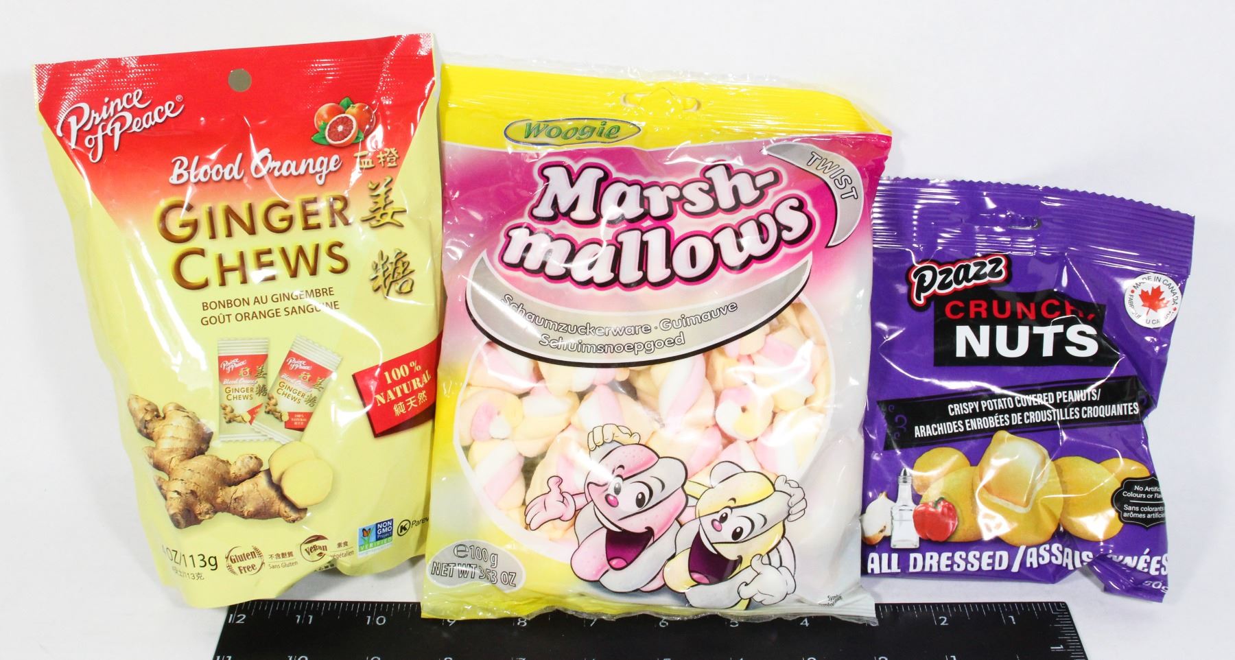 WOOGIE MARSHMALLOW TWISTS 100G PZAZZ CRUNCHY NUTS ALL DRESSED 80G BLOOD ORANGE GINGER CHEWS 113G