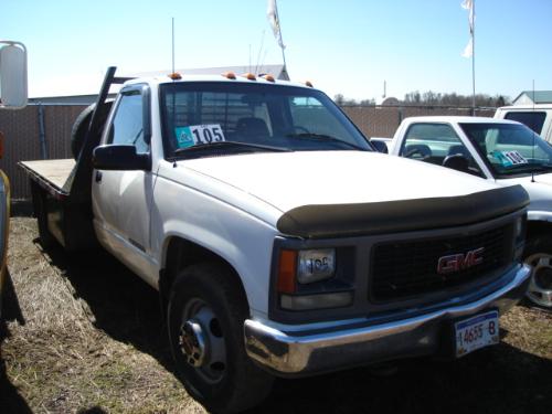 1998 GMC SIERRA SL 3500 S/A FLATBED TRUCK, s/n 1GDHC34RXWFO44O92 : V8 GAS ENGINE, 5 SPD O/D TRANS, 11ft. BED, HEADACHE RACK