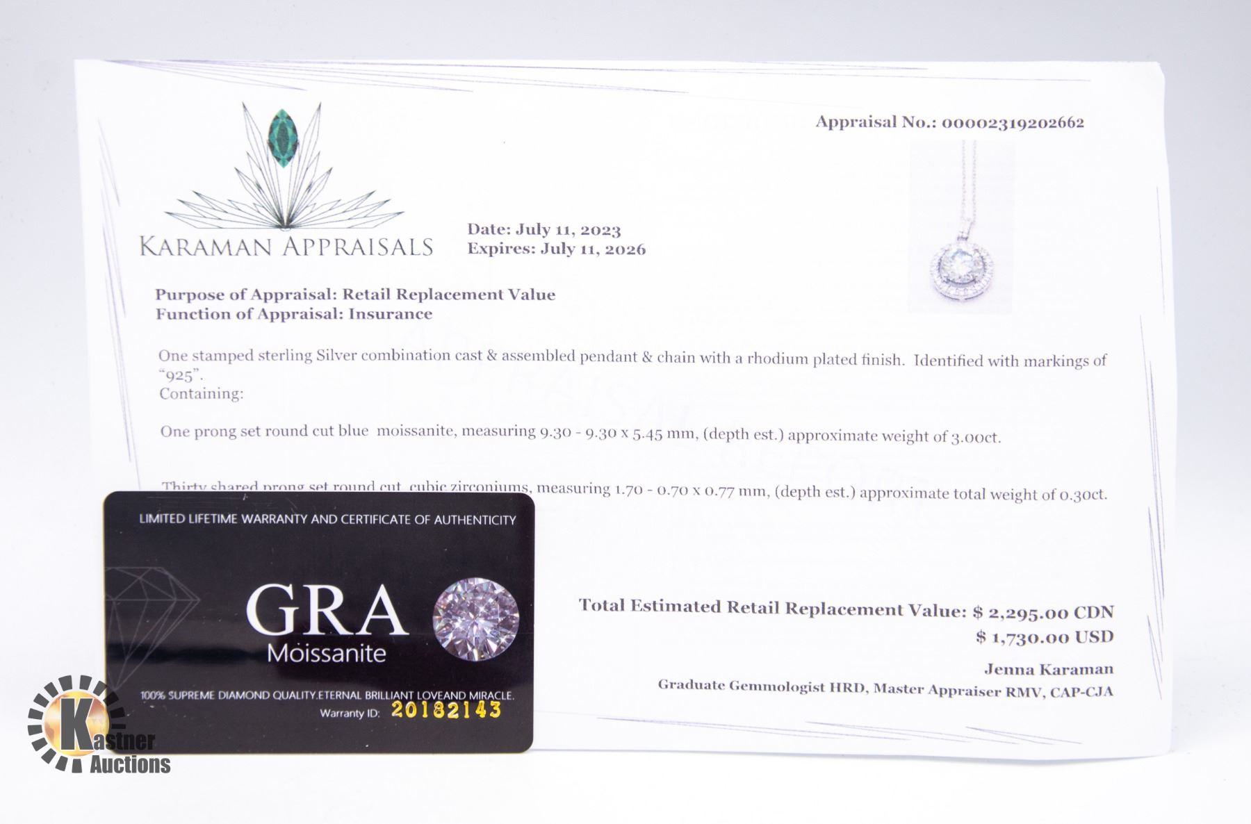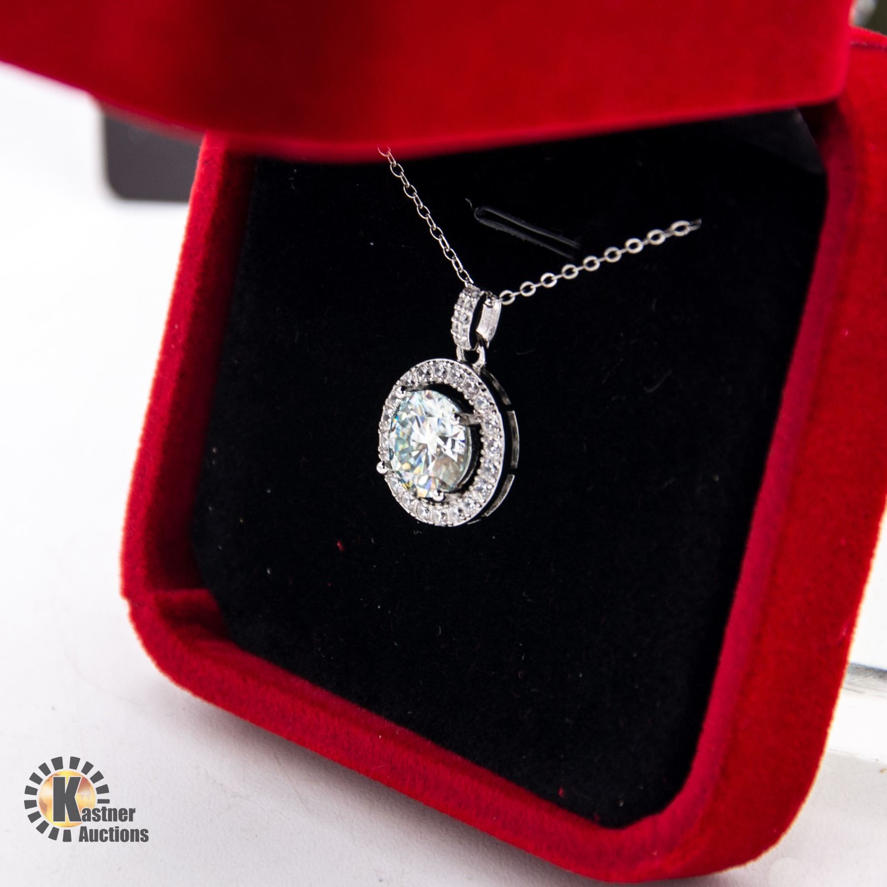 SURROUNDED BY HALO OF 30 MOISSANITE INCLUDING SOME SET IN BAIL SET IN SILVER PENDANT AND NECKLACE APPRAISED VALUE $2,295.00 **ALL ITEMS MUST BE REMOVED BY 5PM SATURDAY, DECEMBER 9TH 2023. ALL REMAINING ITEMS WILL BE SUBJECT TO A $6.00 PER DAY STORAGE CHARGE. ANY ITEMS REMAINING AFTER THURSDAY, DECEMBER 21ST 2023 WILL BE CONSIDERED FORFEITED. NO REFUNDS WILL BE ISSUED FOR FORFEITED ITEMS. TO SCHEDULE A PICK UP APPOINTMENT CLICK HERE