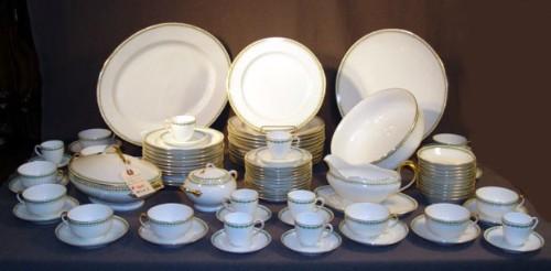 GREEN & GILT BORDERED LIMOGES CHINA W/ BAVARIAN DEMITASSE CUPS, 80 PCS TOTAL