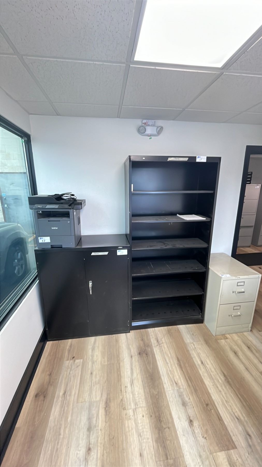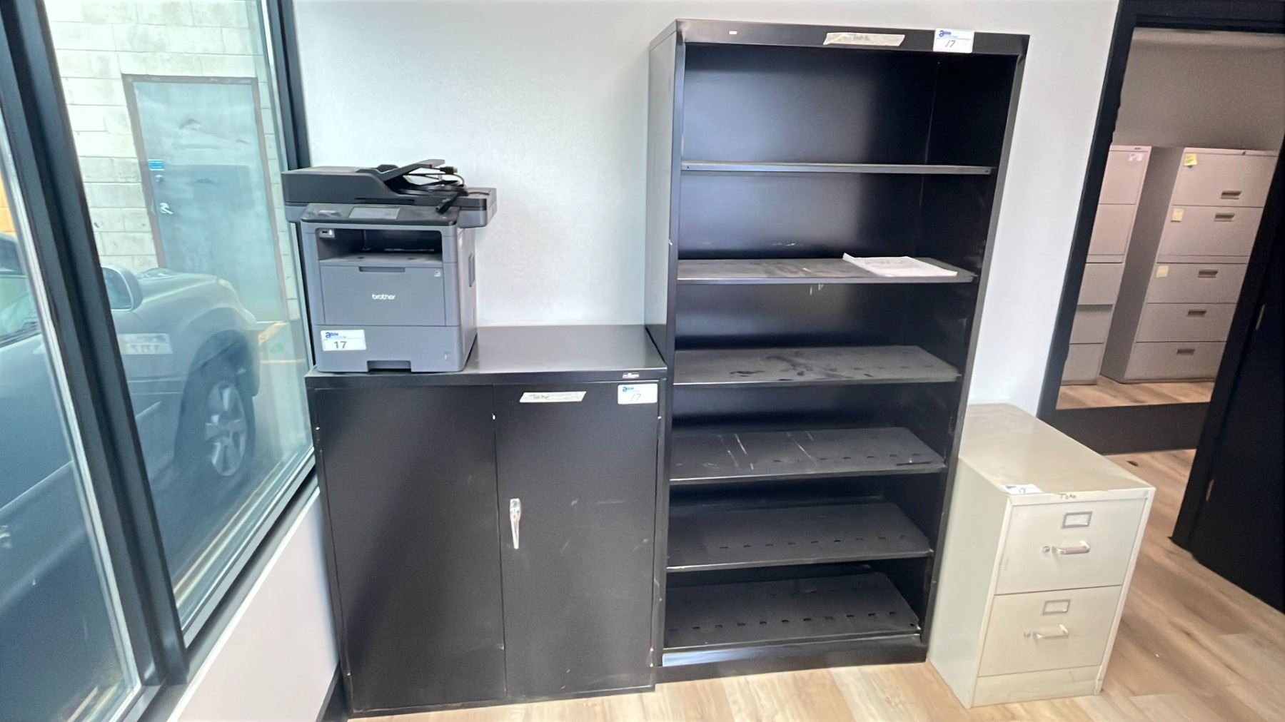 GROUP OF (4) OFFICE ITEMS - BROTHER MFC-L6700DW PRINTER, PROSOURCE 2 DOOR METAL CABINET, METAL BOOKSHELF AND 2 DRAWER METAL FILING CABINET