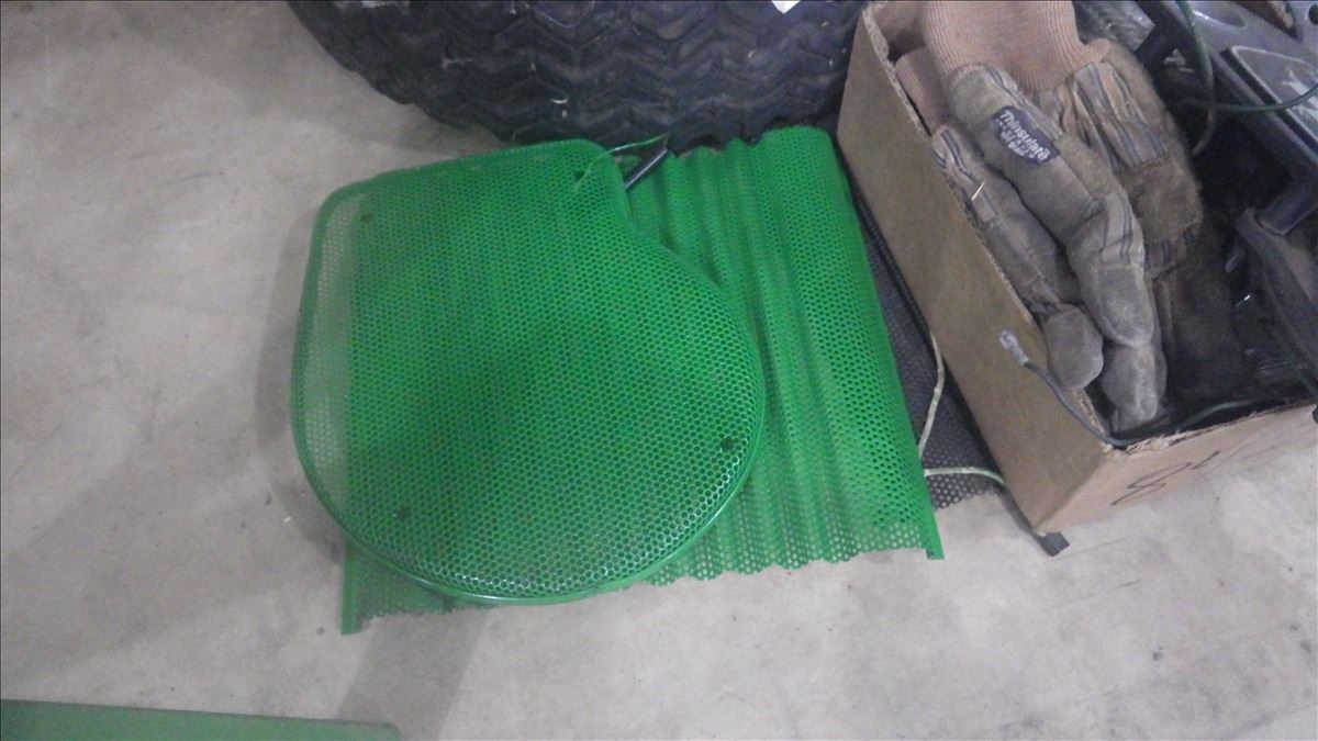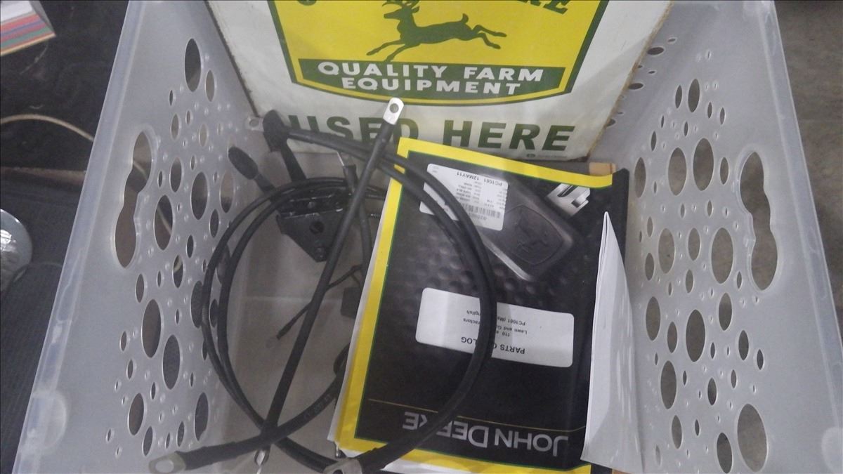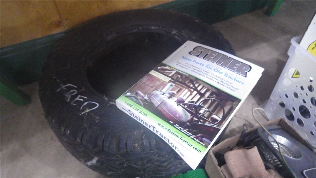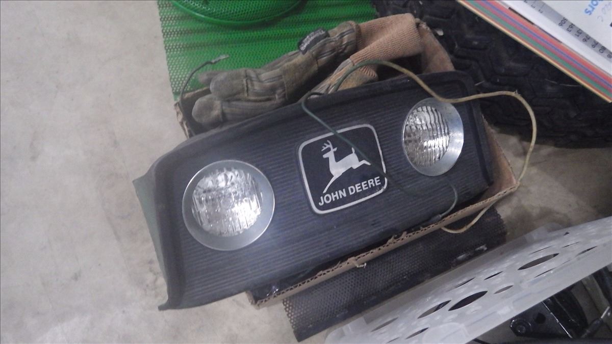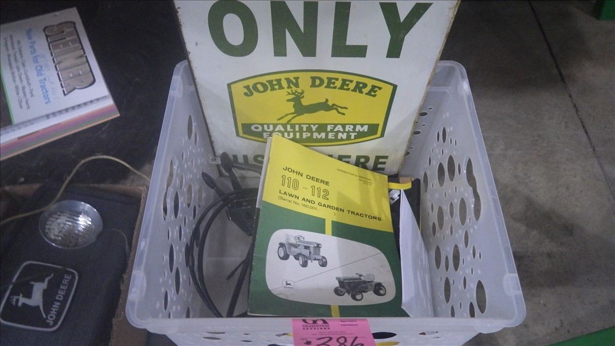 GROUP OF J.D. "110" AND "112" GARDEN TRACTOR PARTS AND SERVICE MANUALS, HEAD LIGHTS, GRILL AND TIRE