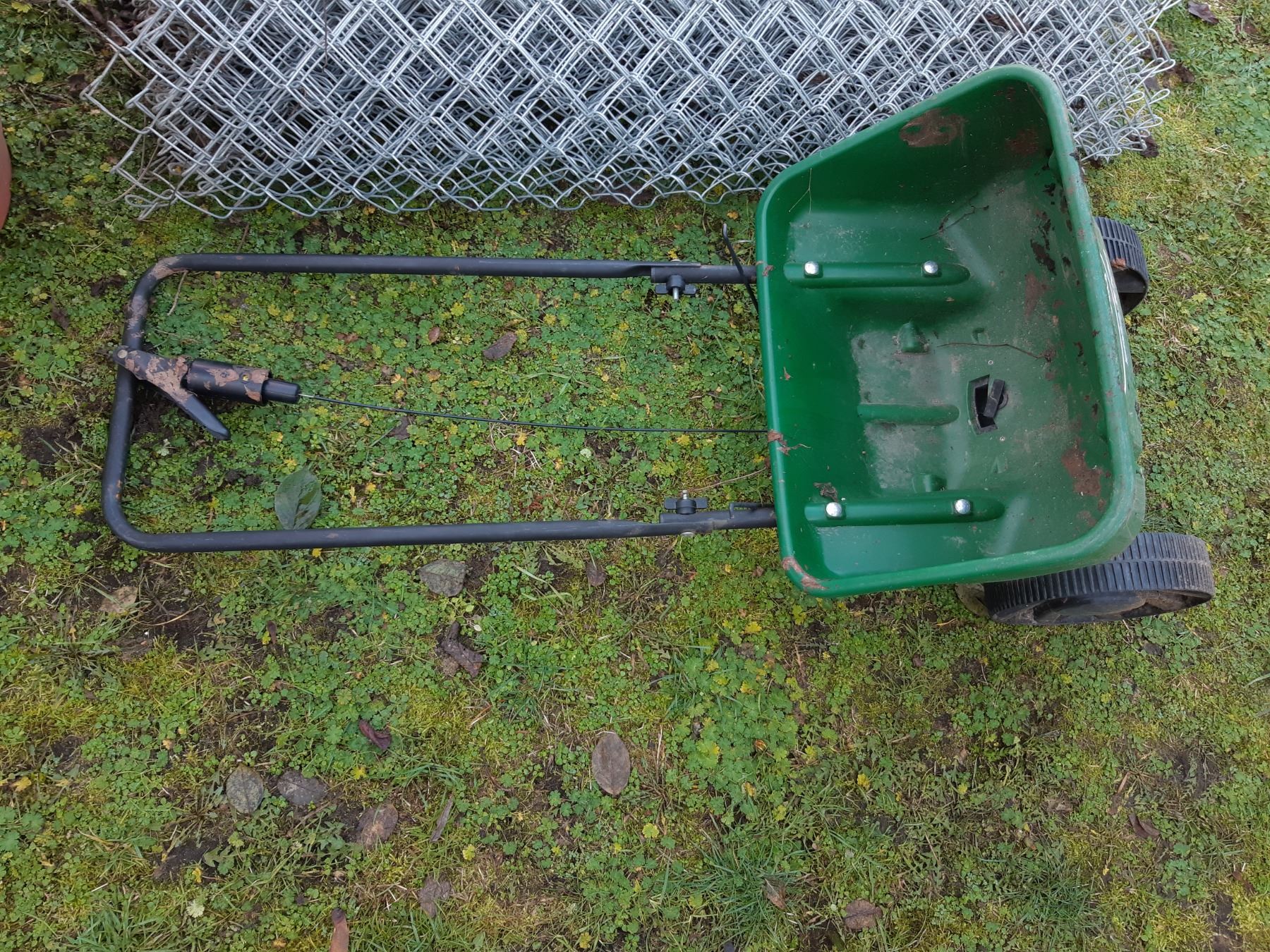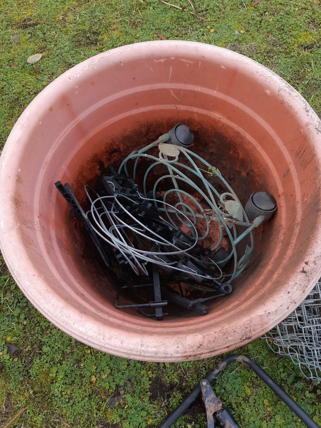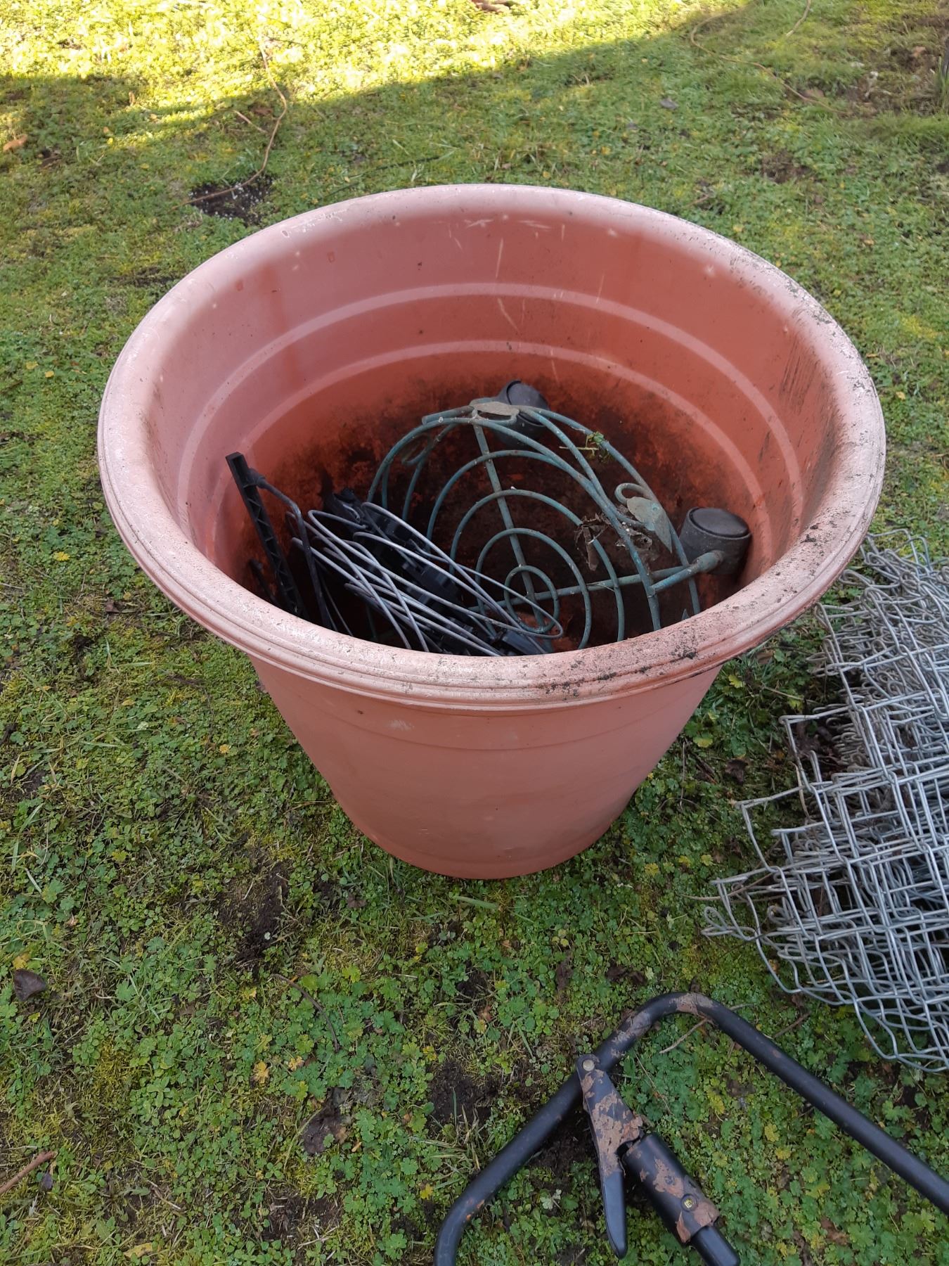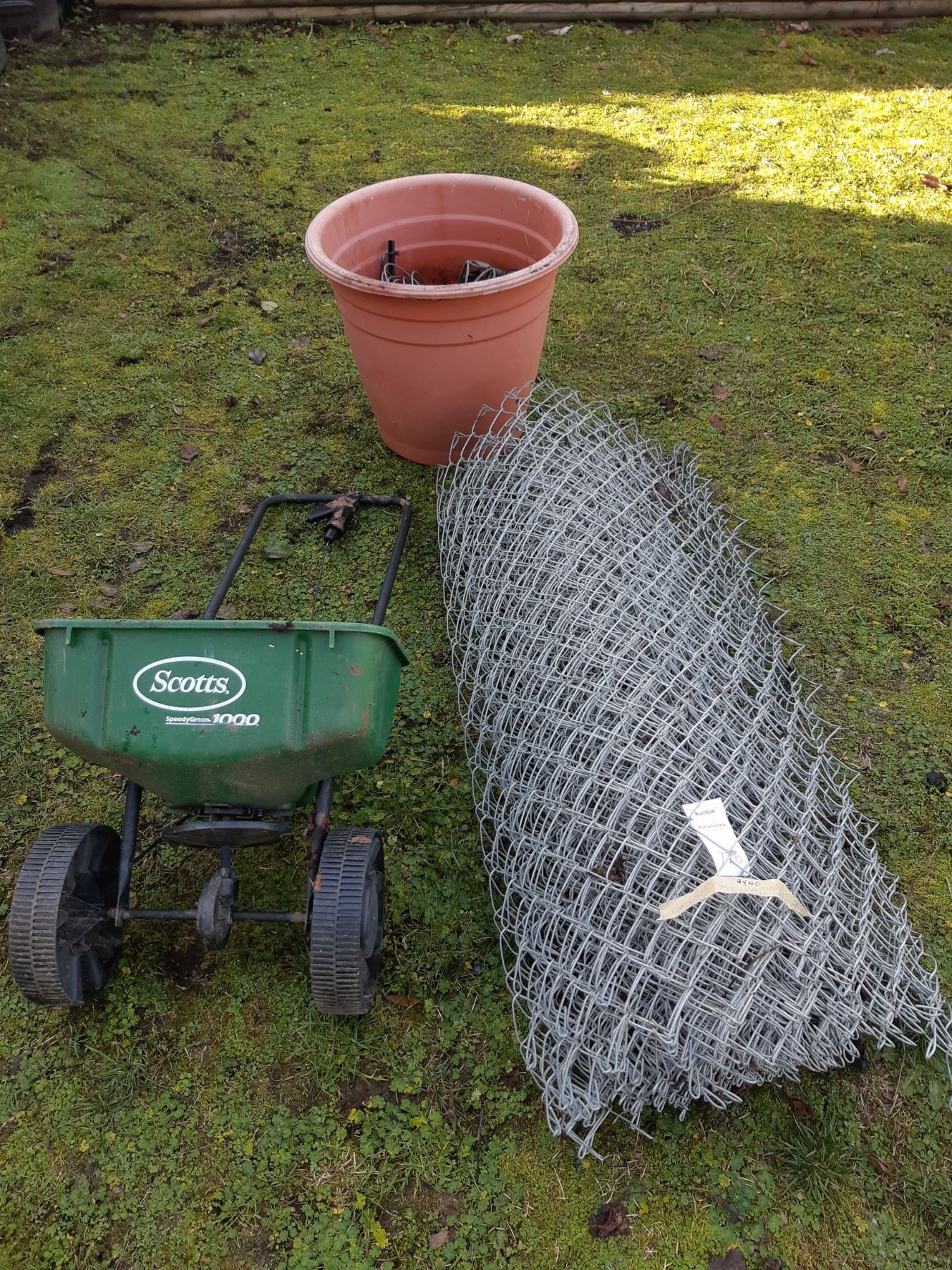 About 40' of chain link fencing, Scotts seed spreader, large garden pot and rolling pot trays. Heavy pickup at 9-11 am