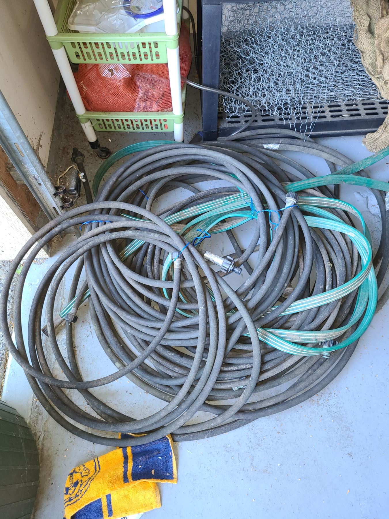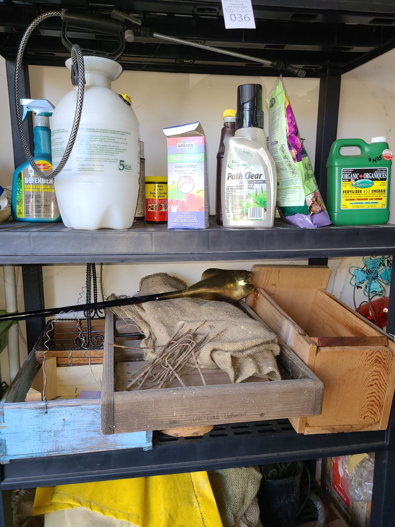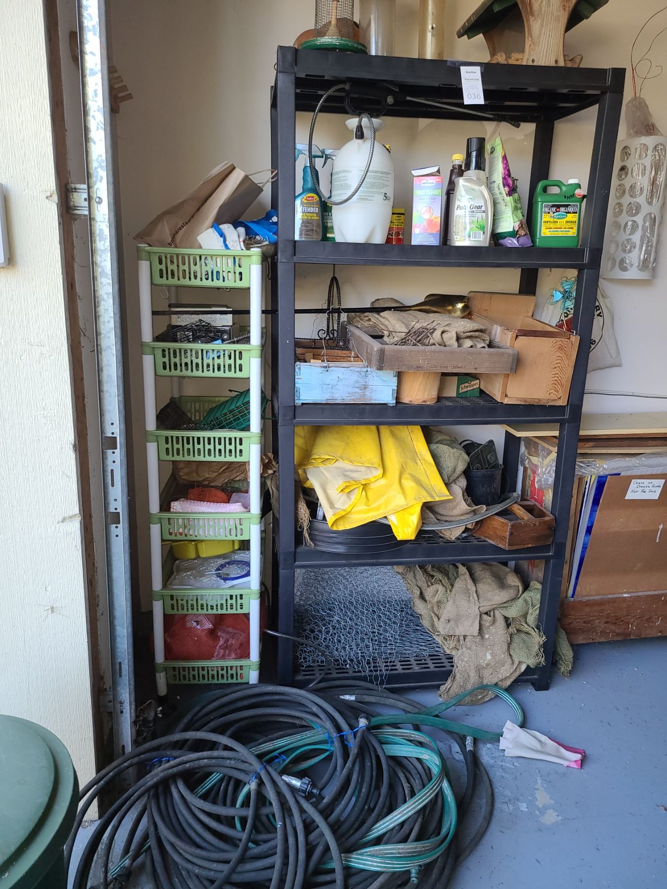 Metal & wood Black plastic portable shelving with gardening supplies, green roll away cart with gardening supplies, Hoses, Humming bird feeders & more. Pickup at 9 am