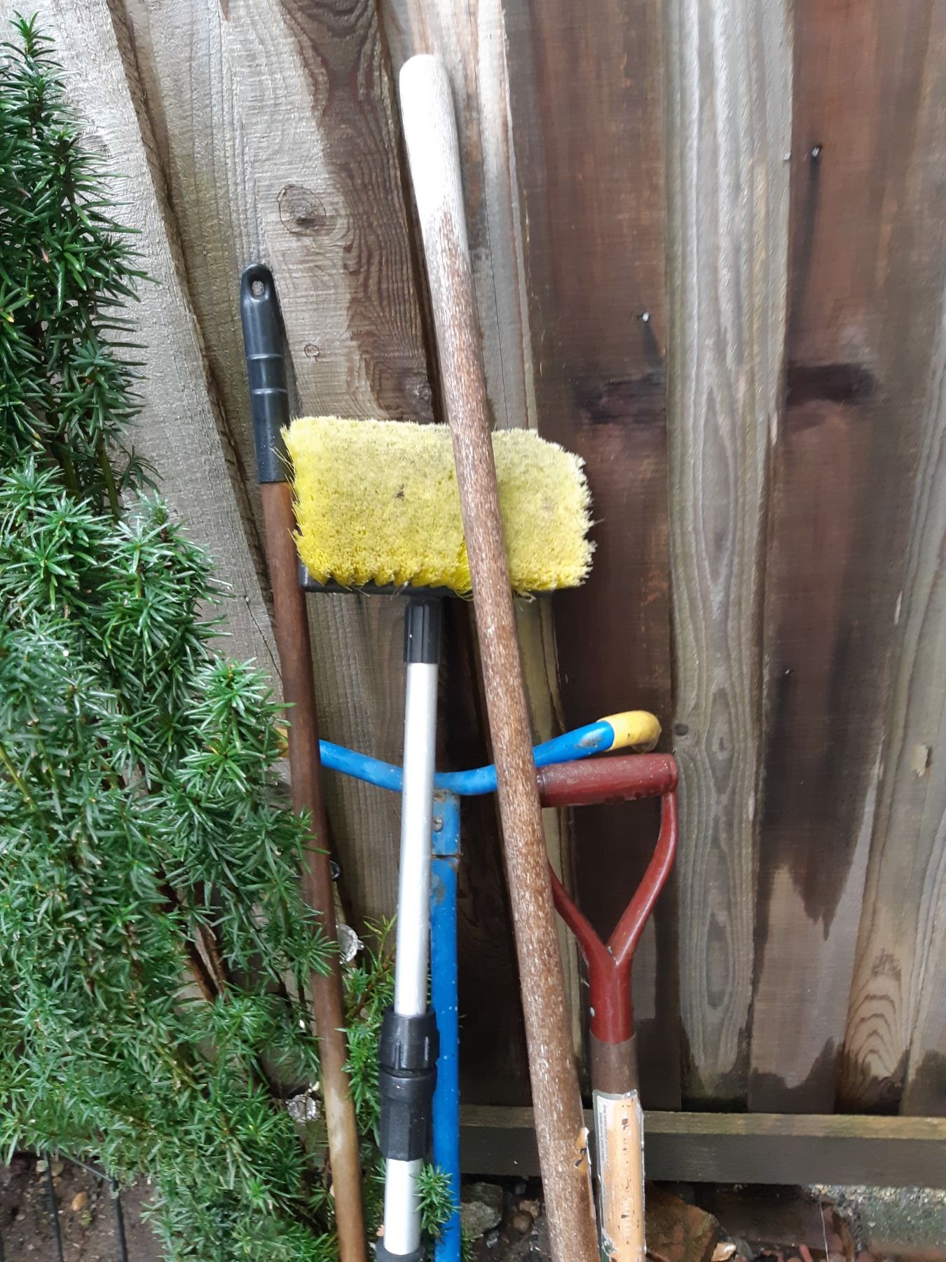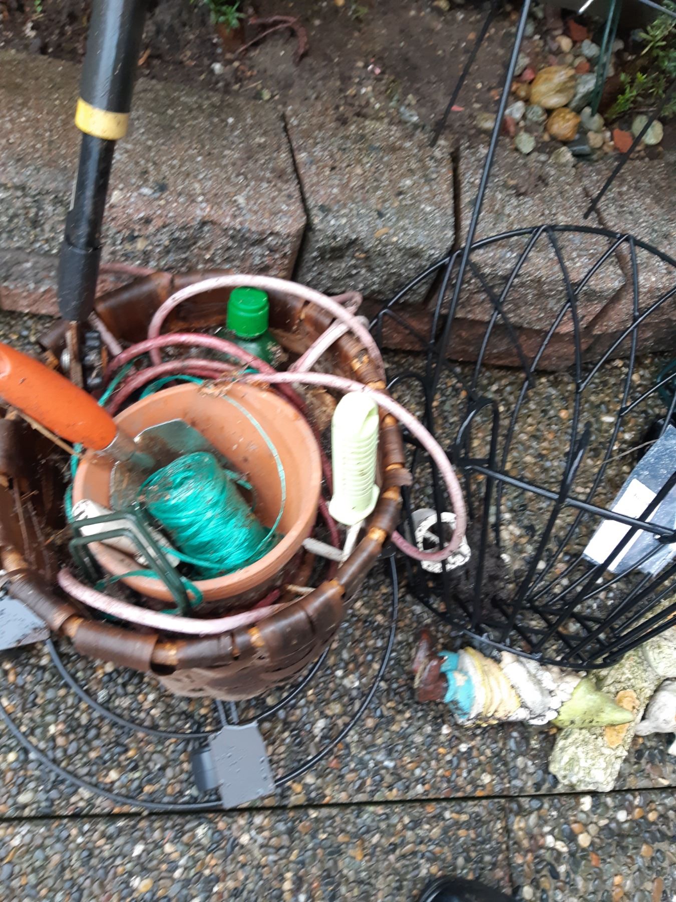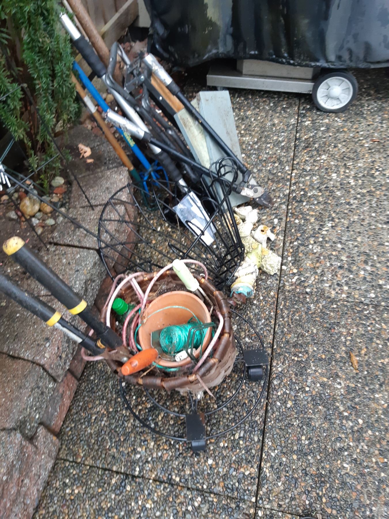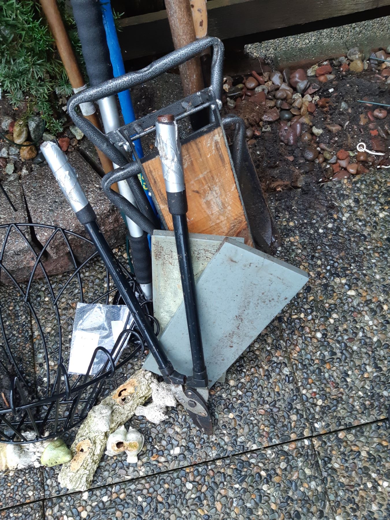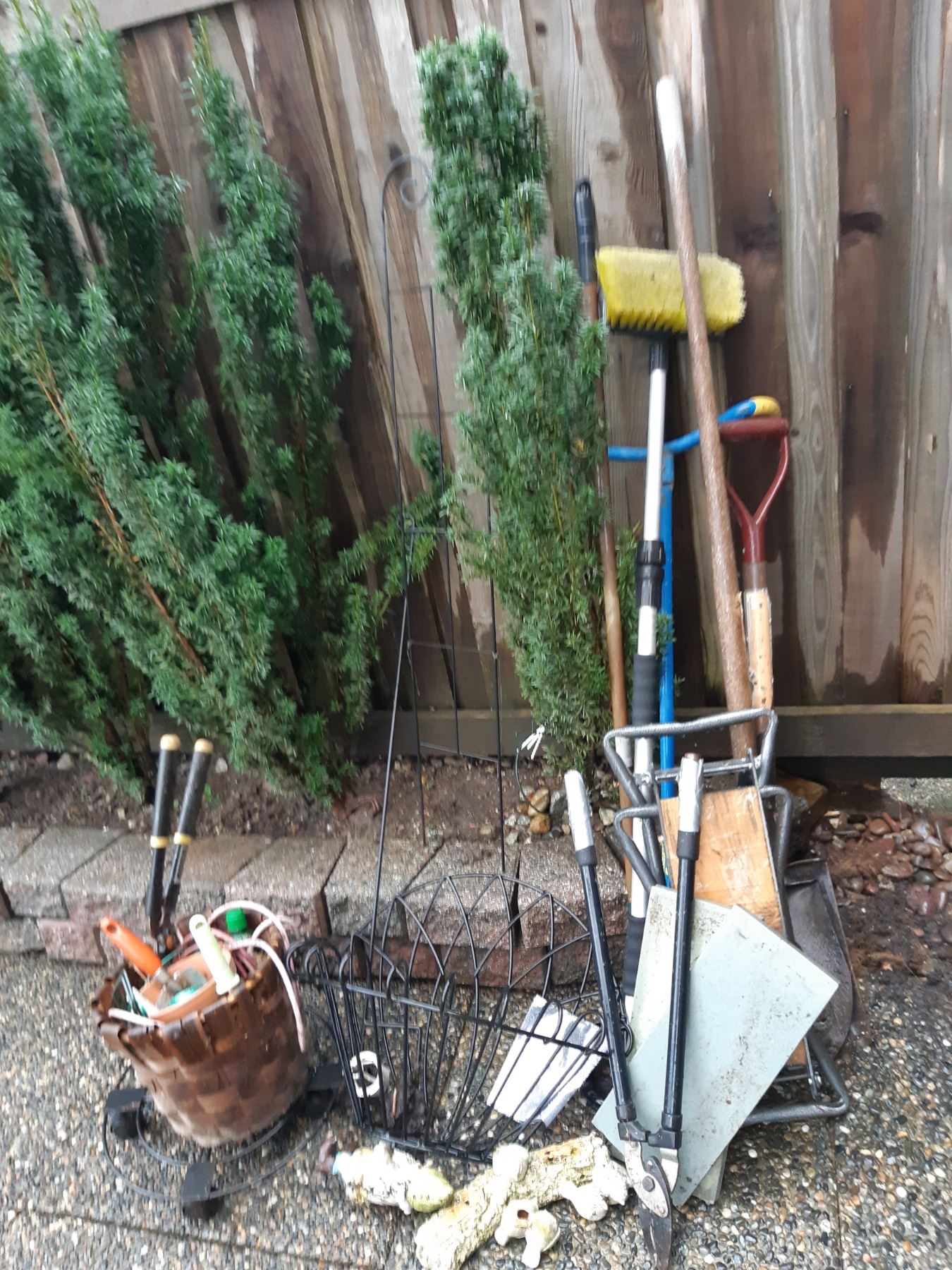 Garden tools, plant supports, pot wheels, and more included. Pickup at 9 am.