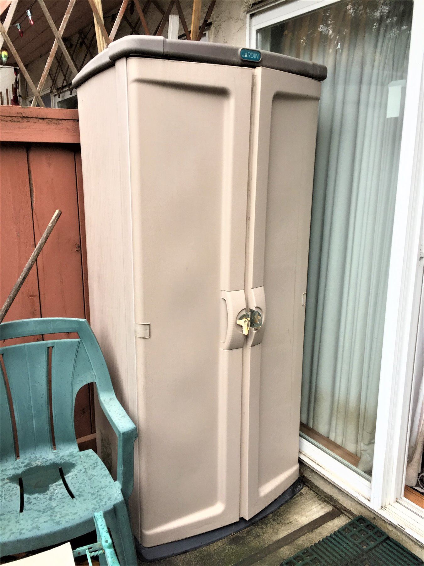 Storage shed, 33x30x73, rake, and sprinkler hose and garden ornaments included. Come to pickup b