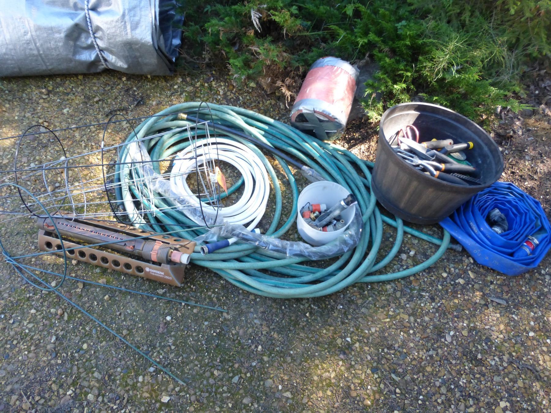 Garden hoe, gardening tools, discharge line, lawn sprinkler, tomato cages and hose fittings