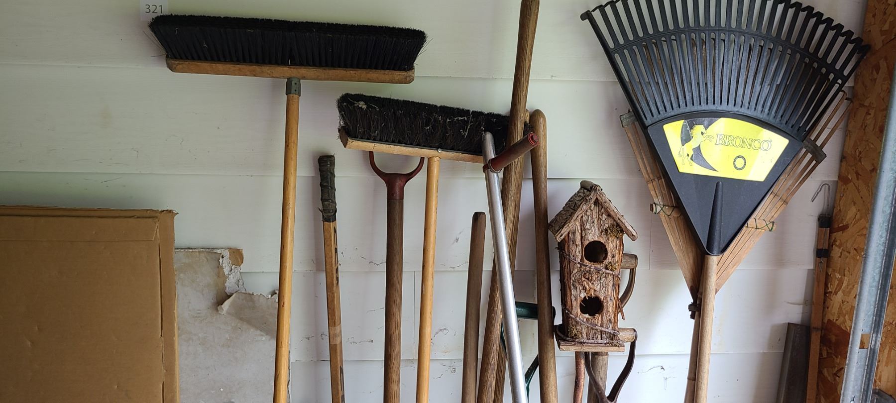 Garden tools, brooms, rakes, shovels, pruners, sprayer, sicke, pickup 1 pm