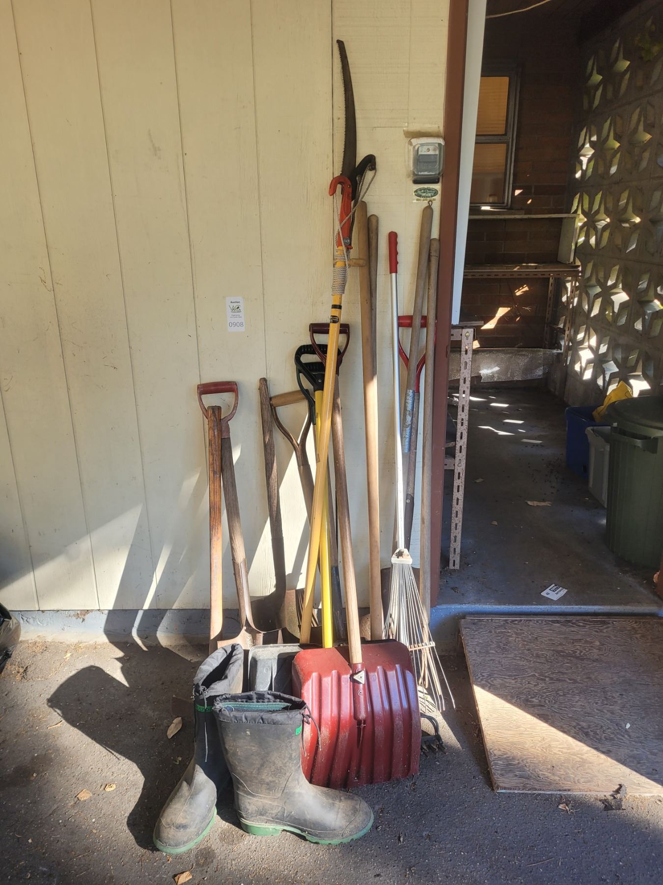 Ax, spades, shovels, rake, fork, snow shovels. Men's Size 11 Vulcan boots. Pickup at 10 am