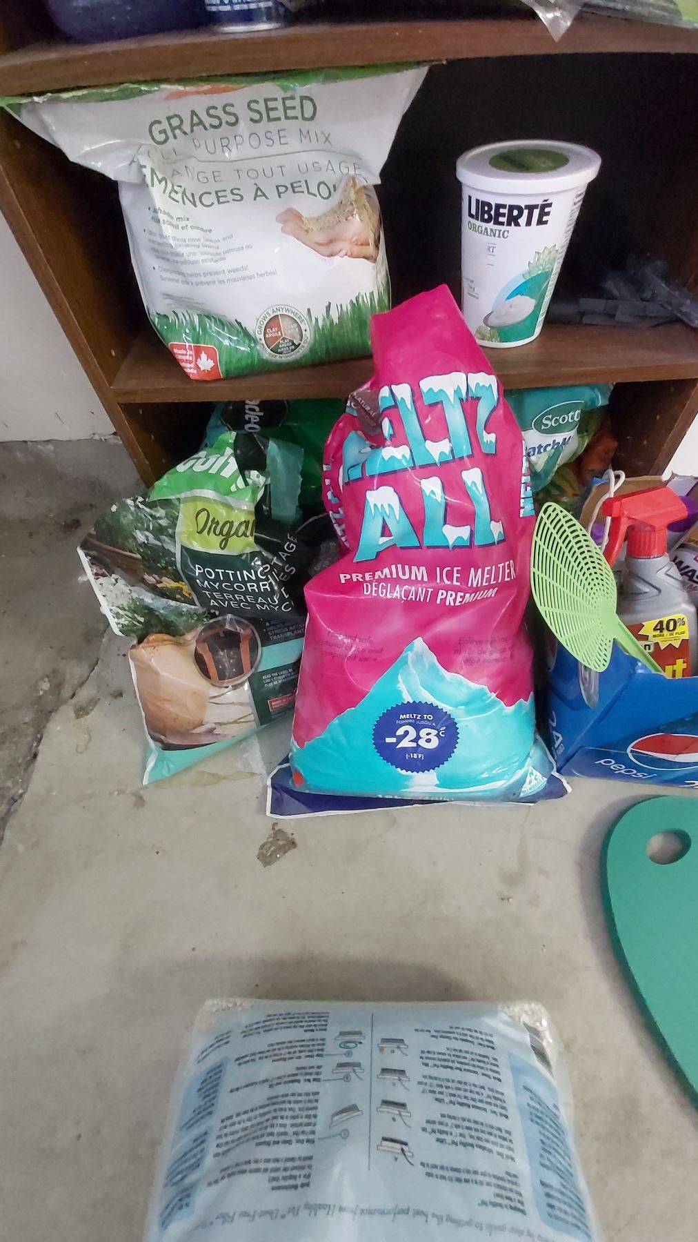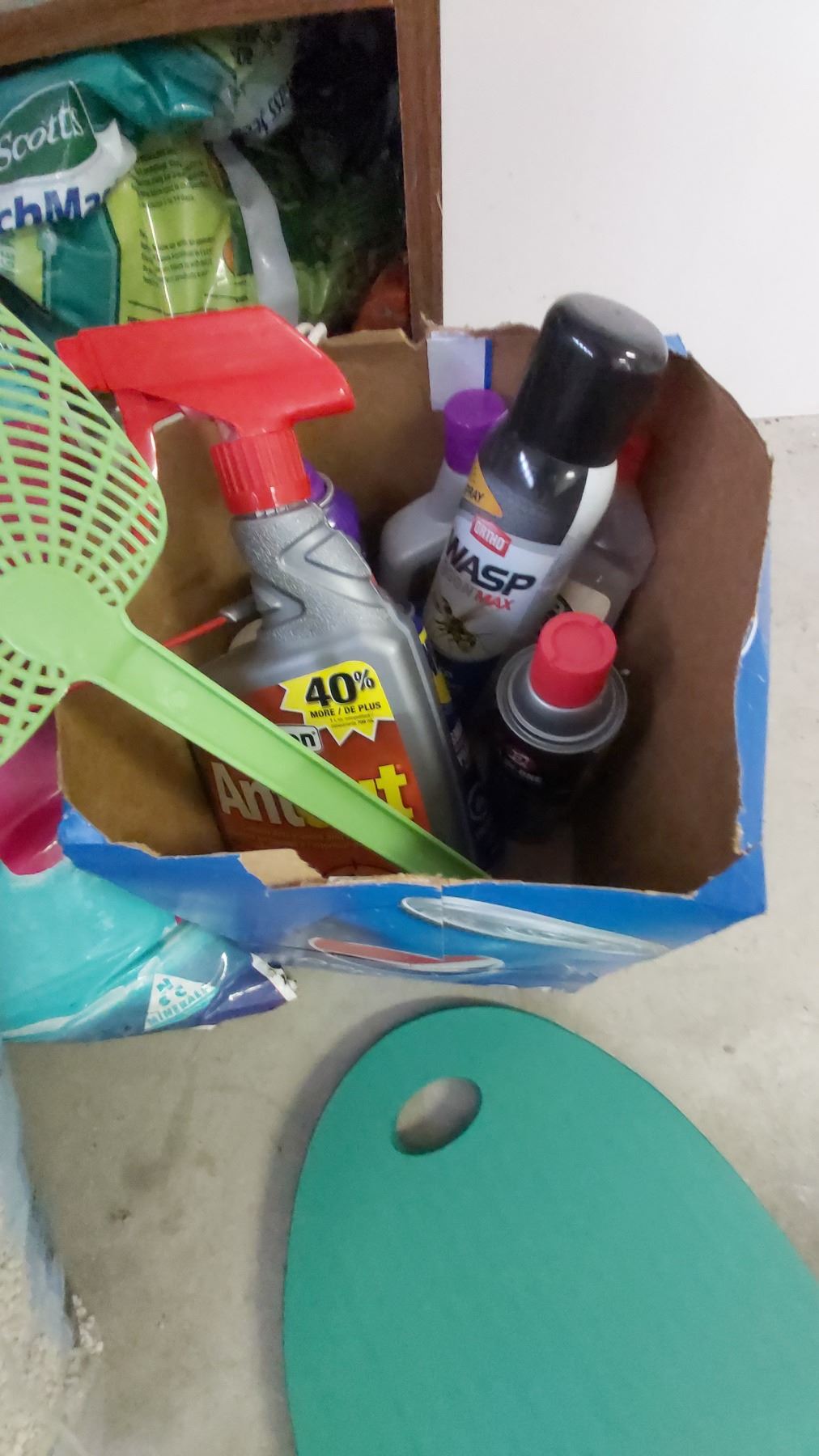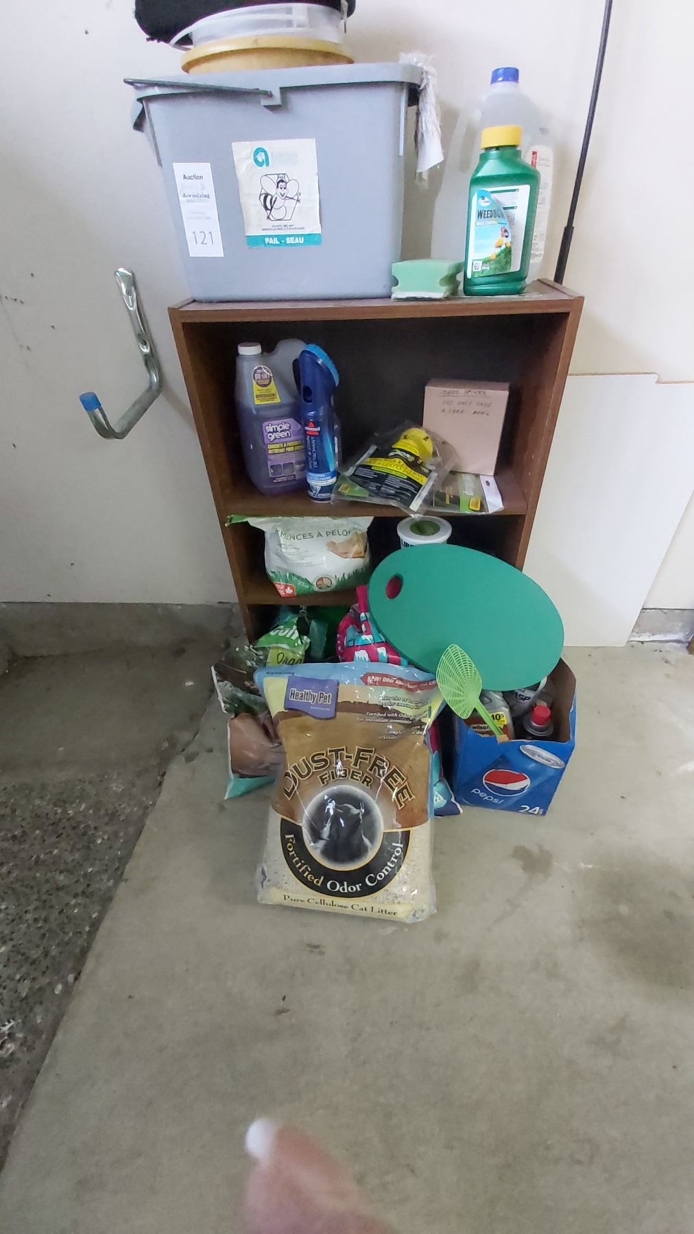 Lot includes garden supplies and sprays, cat litter, cleaning supplies, and concrete cleaner. Bring boxes. Pickup at 10am, cat. B.