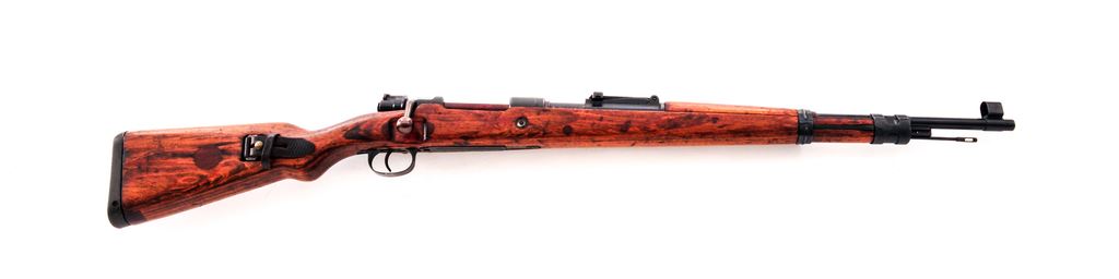 German Model Kar 98k Mauser Bolt Action Rifle, #7357Y, 8x57mm cal., 23.6'' barrel, blued finish, laminated stock, inverted ''V'' front sight with hood and adjustable tangent rear sight. Marked on receiver ring ''dot 1944'' with a Waffenampt 63 code stamp and on left side receiver rail ''Mod.98''. No markings visible on stock. All numbers mismatched. Includes a cleaning rod and unmarked German WWII style leather sling in very good condition. Hole drilled through bayonet lug. Condition overall is very good with approx. 95 % finish remaining on metal surfaces, with frosting on the floorplate and a matte finish to the buttplate. Bolt has been reblued and toned to a plum color. Stock has several areas with dowel and spliced wood repairs of darker color. Wood has been sanded and refinished with a satin type stain, in very good condition showing only a few old handling marks. Action is smooth, bore is very good. No visible import stamps. Est.: $450-$650. (C&R)