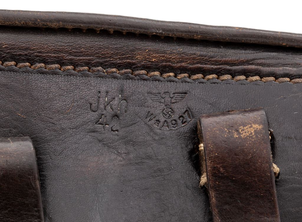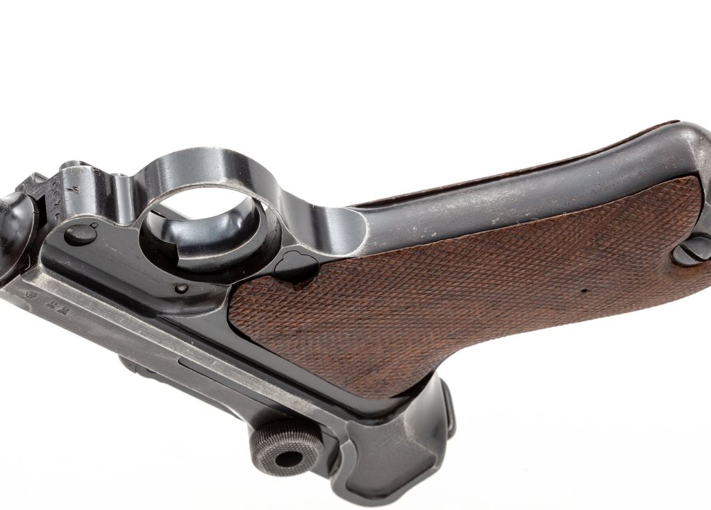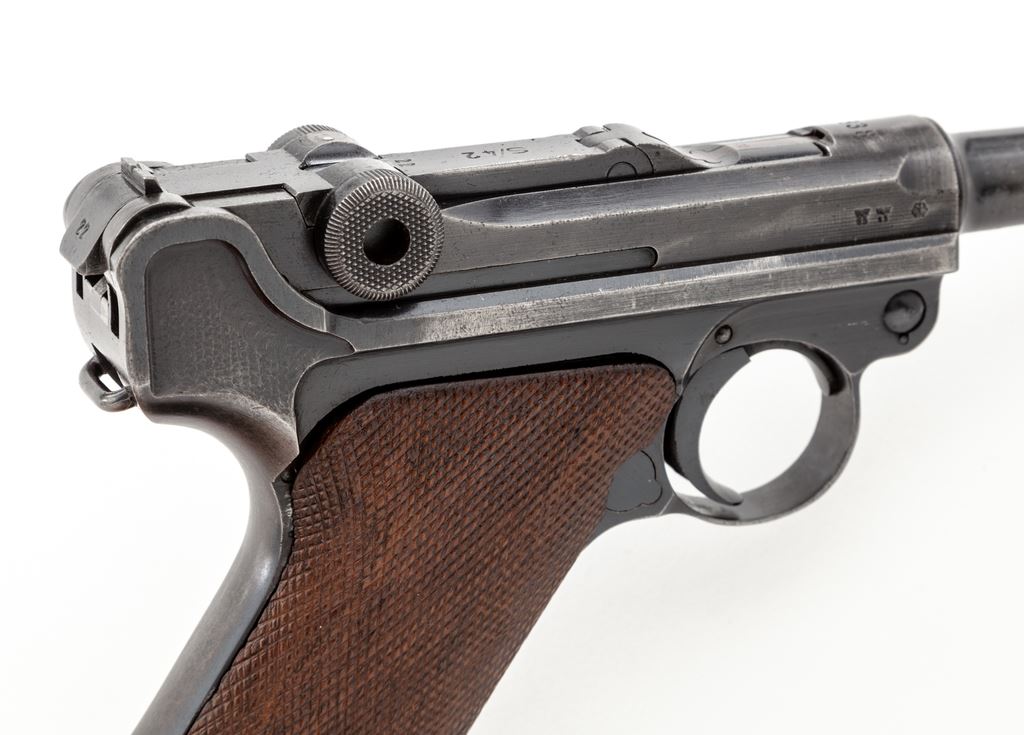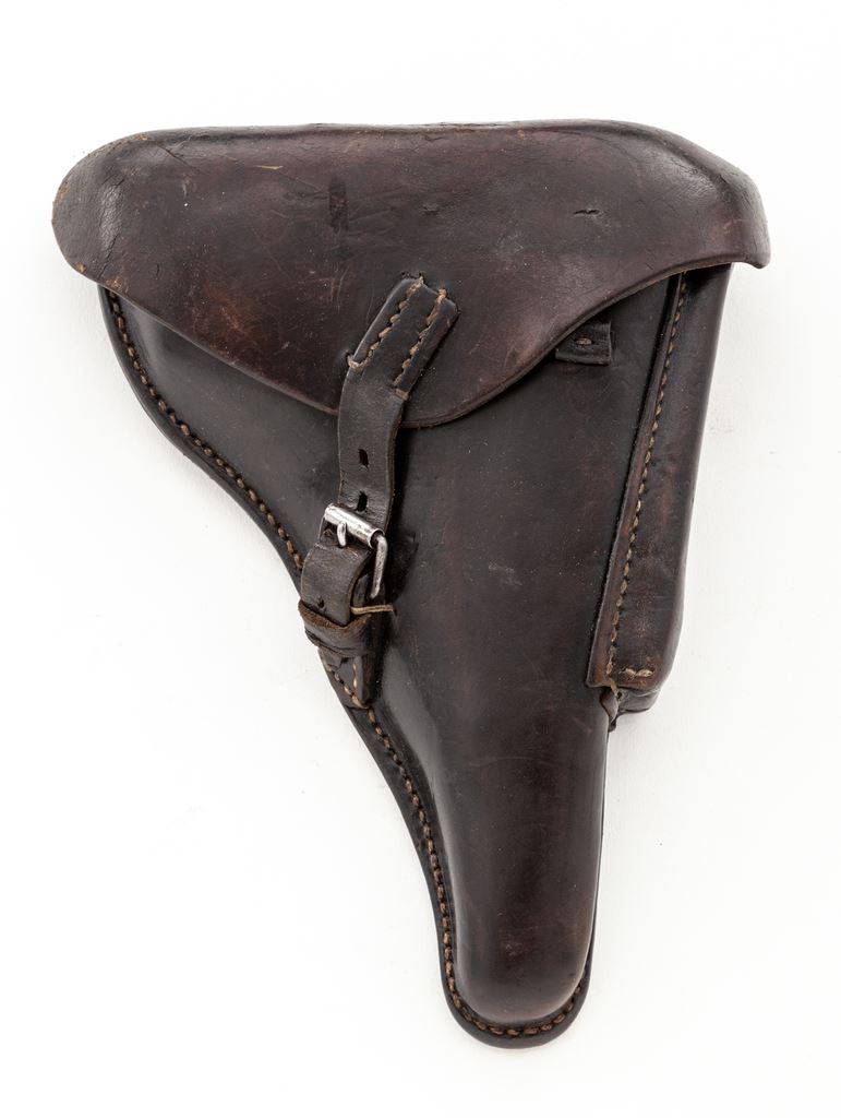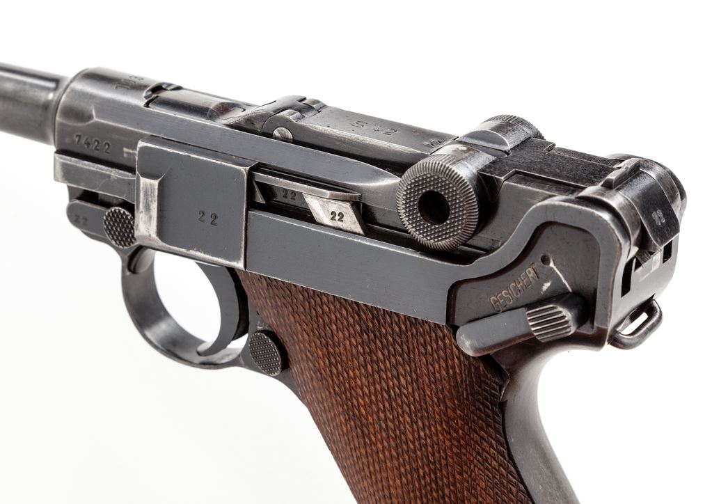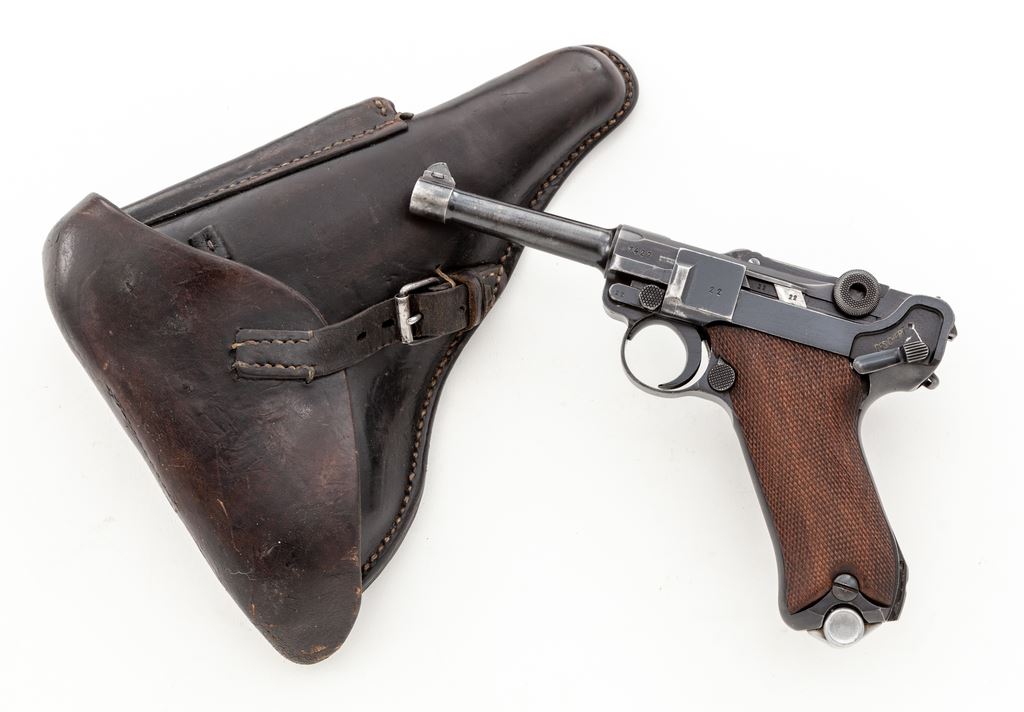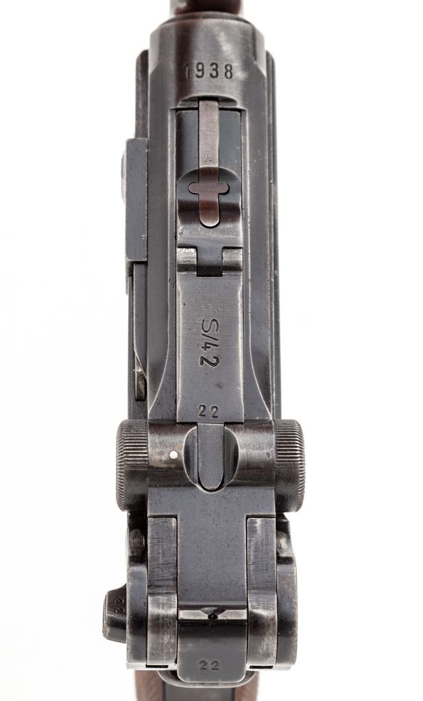 German P.08 Luger, by Mauser (1938-S/42), #7422h, 9mm, 4'' barrel, blue finish, checkered walnut grips, with one mismatched blue-bodied WWII era magazine, in ''42'' dated black leather holster, with one additional aftermarket magazine and one combination tool. 1938 dated chamber, ''S/42'' marked toggle, with all visible matching numbers. Condition is fine retaining approx. 85%-90% original blue. Grips have been re-checkered and right panel fits loosely. Action is good, bore is fine. Holster is very good with some darkening to stitches. Est.: $1,000-$1,500. (C&R/PPT)