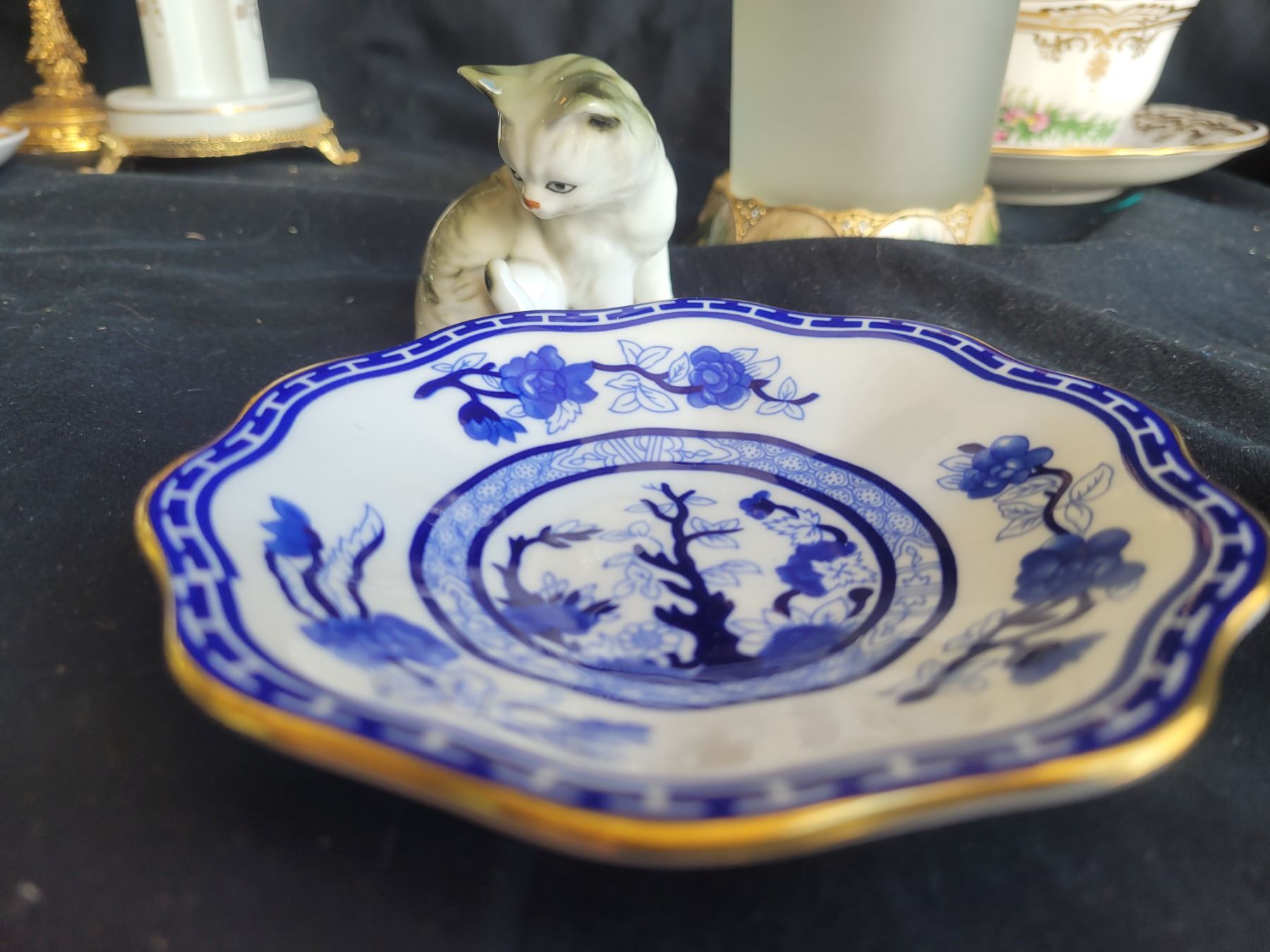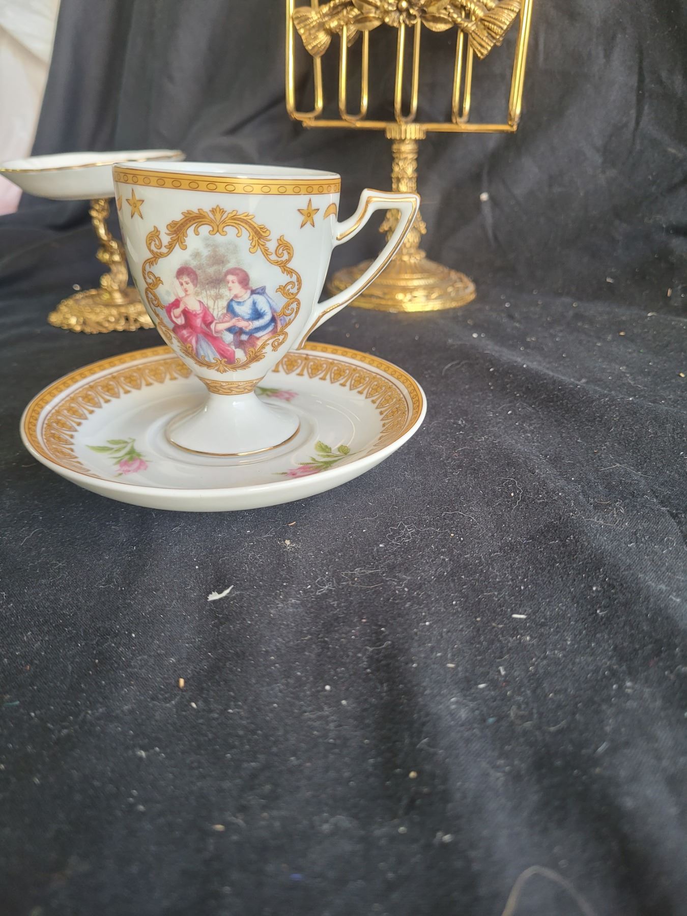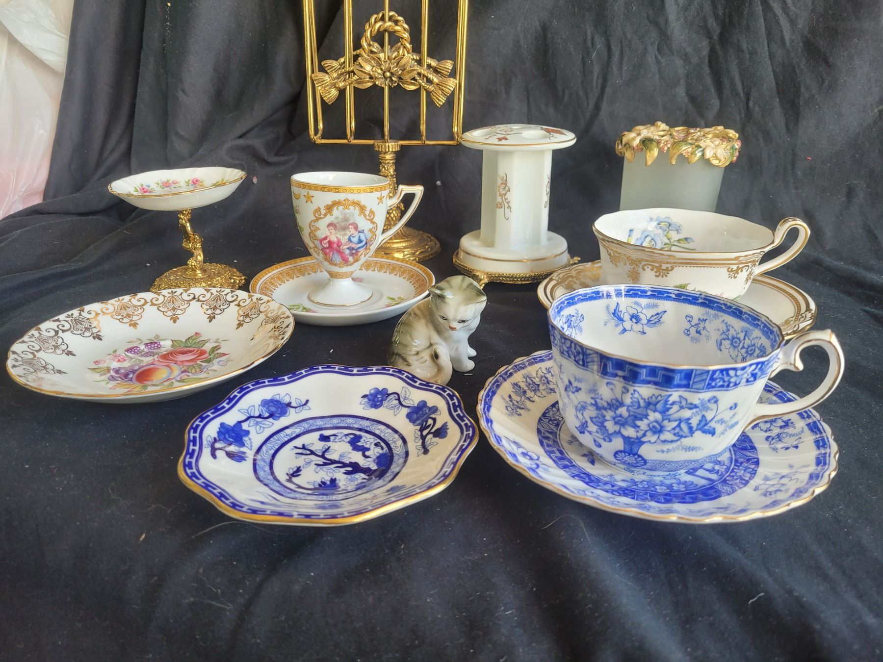 Spode teacup and saucer, Gladstone cup and saucer, porcelain decor, gilt napkin stand and porcelain soap holder and more. Pickup at 9 am