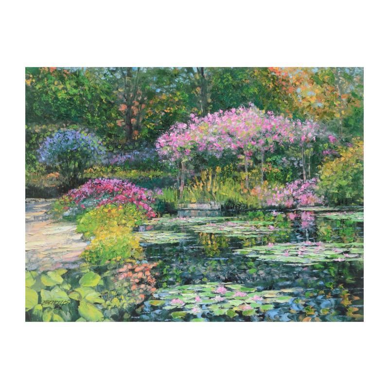 Giverny Lily Pond is a limited edition giclee on canvas by Howard Behrens (1933-2014), numbered and bearing the authorized signature of the artist. This piece is from Behrens Legacy Edition. Includes Certificate of Authenticity. Measures approx. 32 x 24 (image). This item requires special handling and may have a longer than usual turnaround.