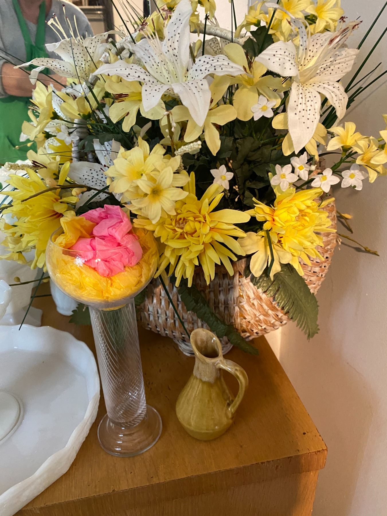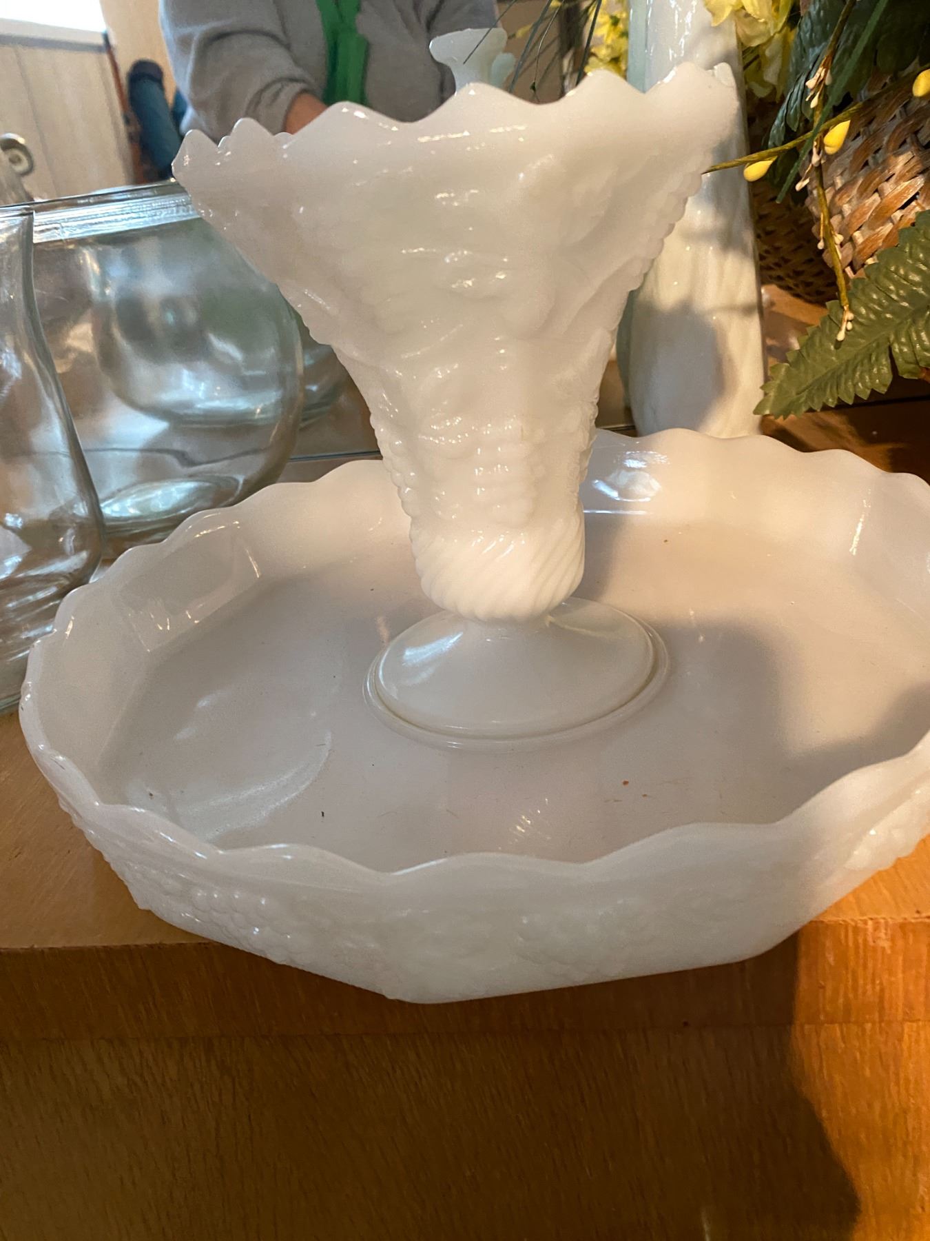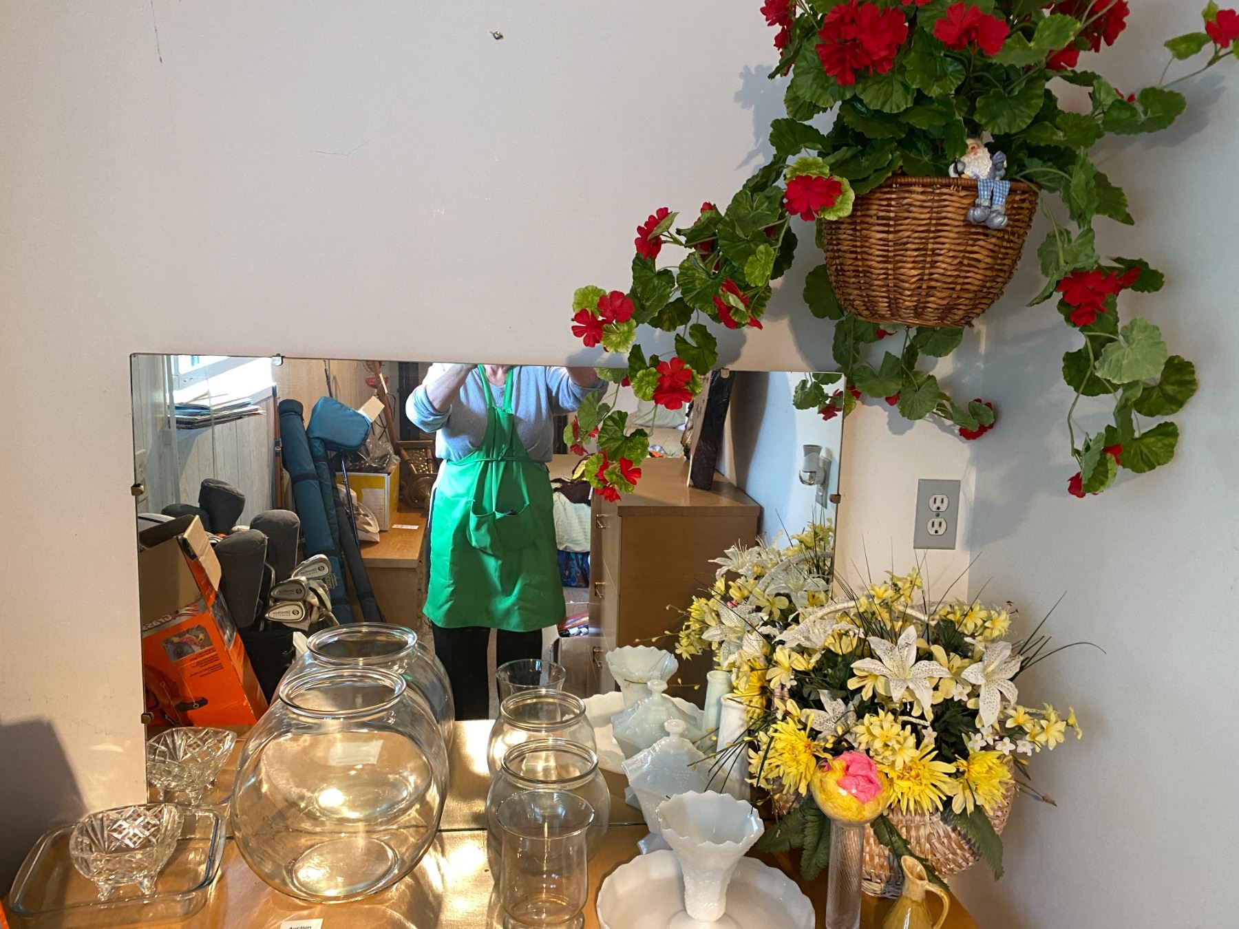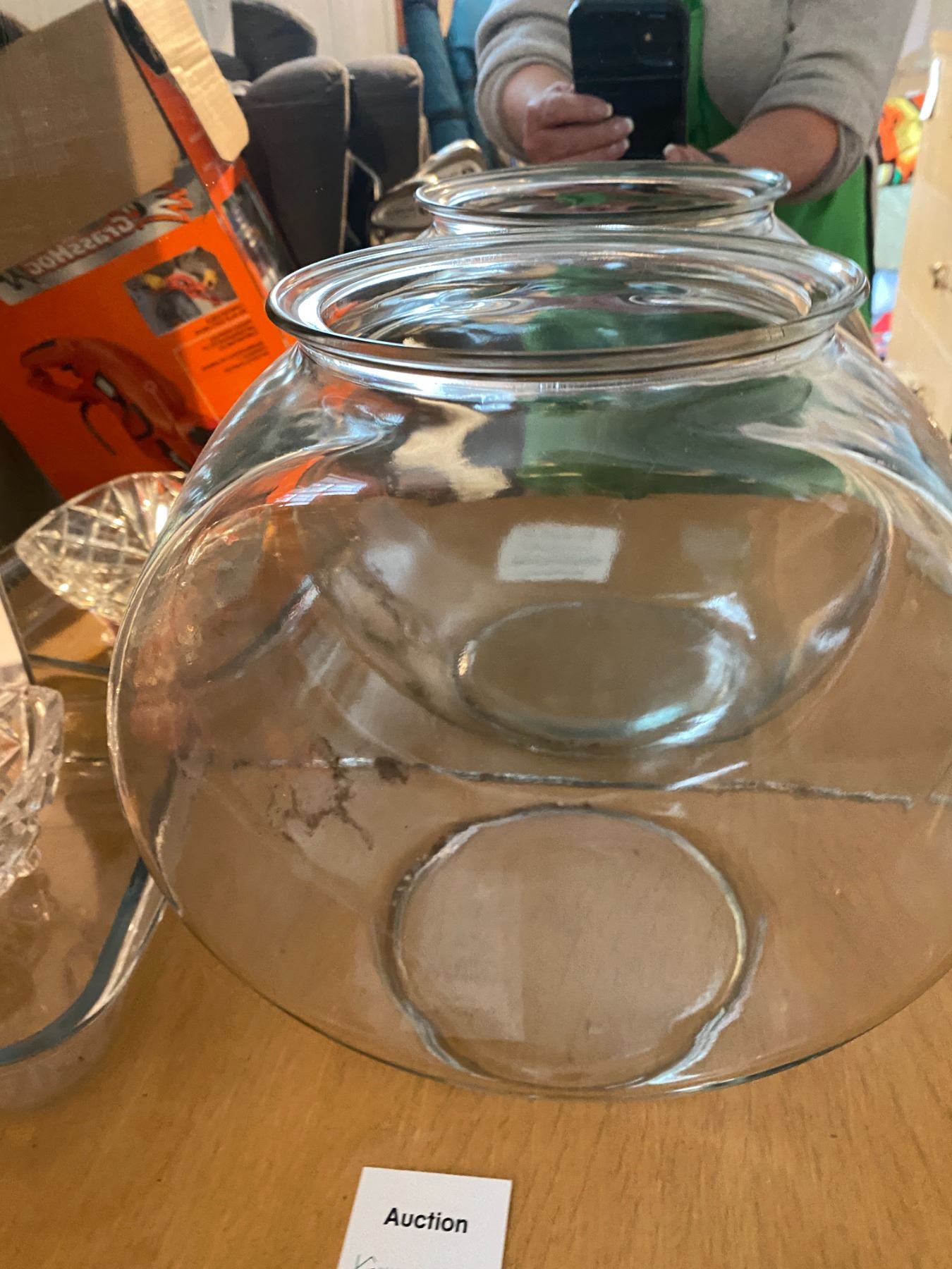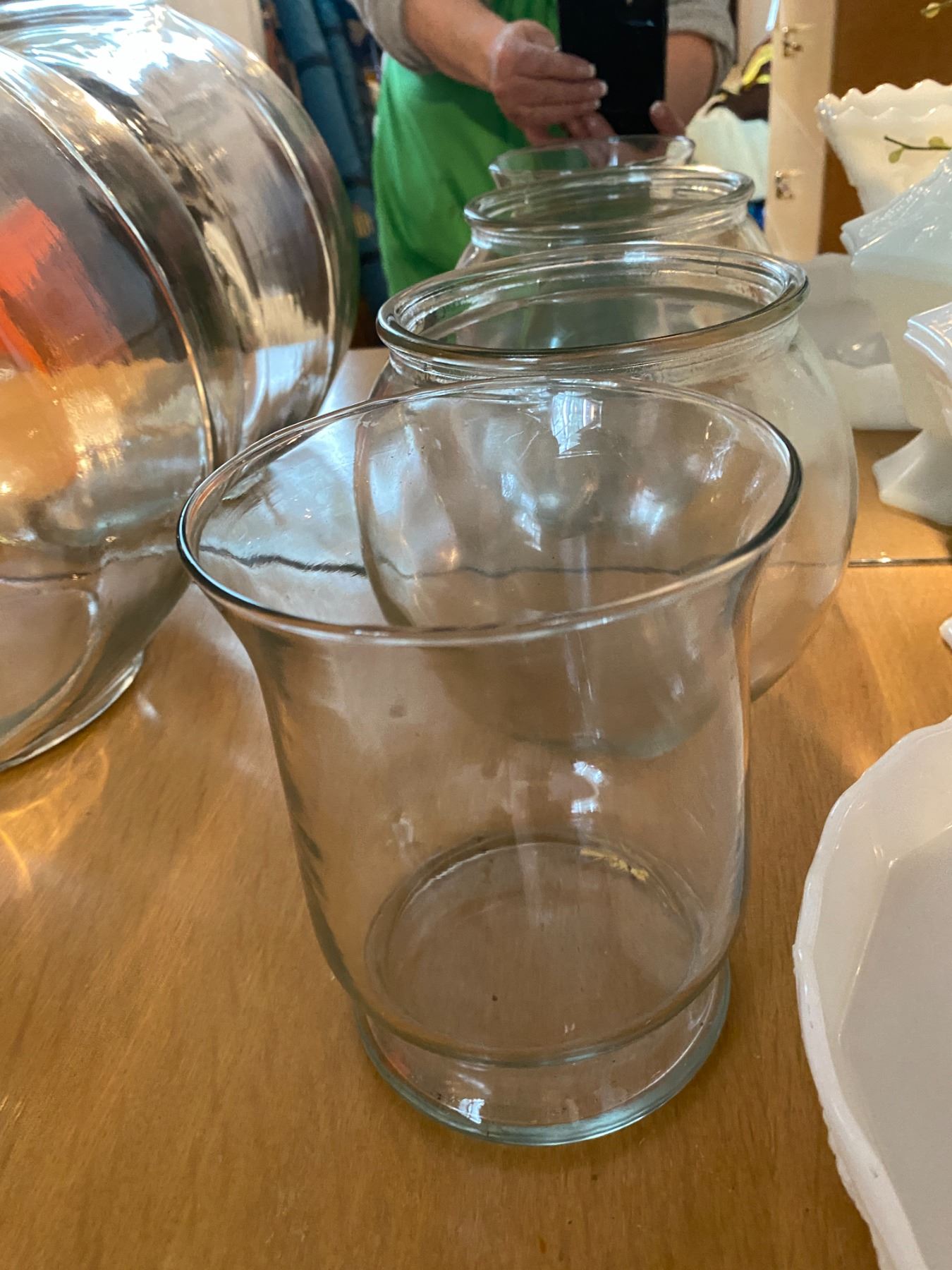 Glass fish bowl, vases, milk glass style vases, faux flowers, more. Pick 9-10