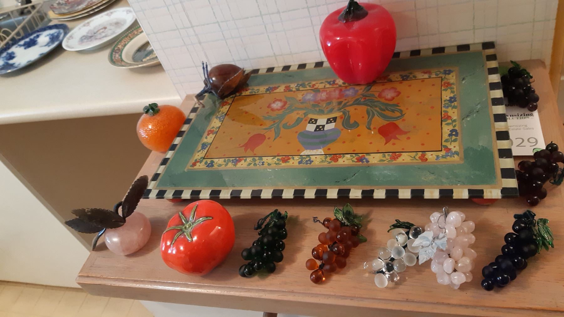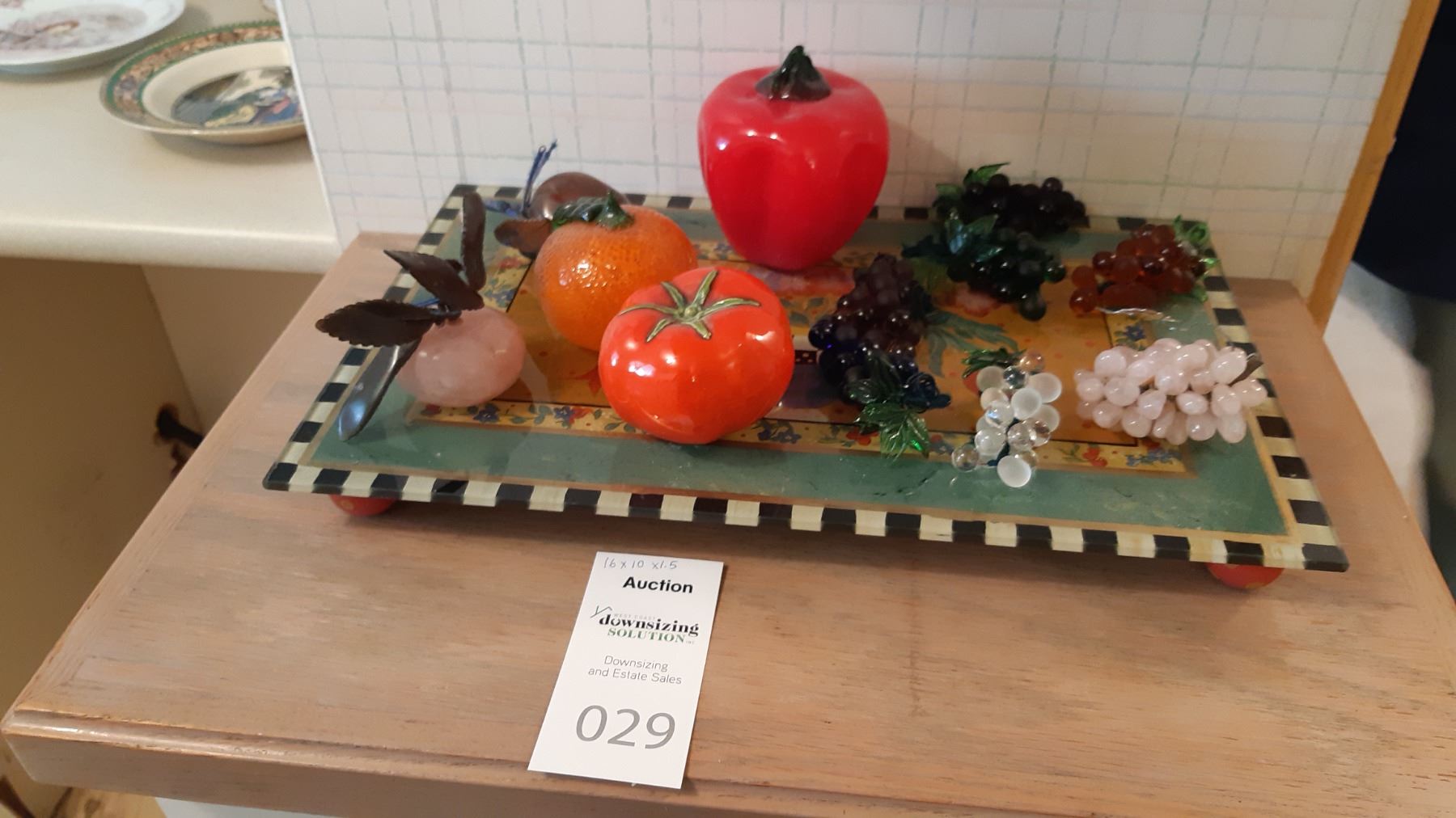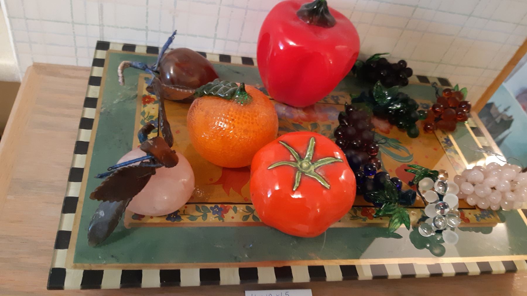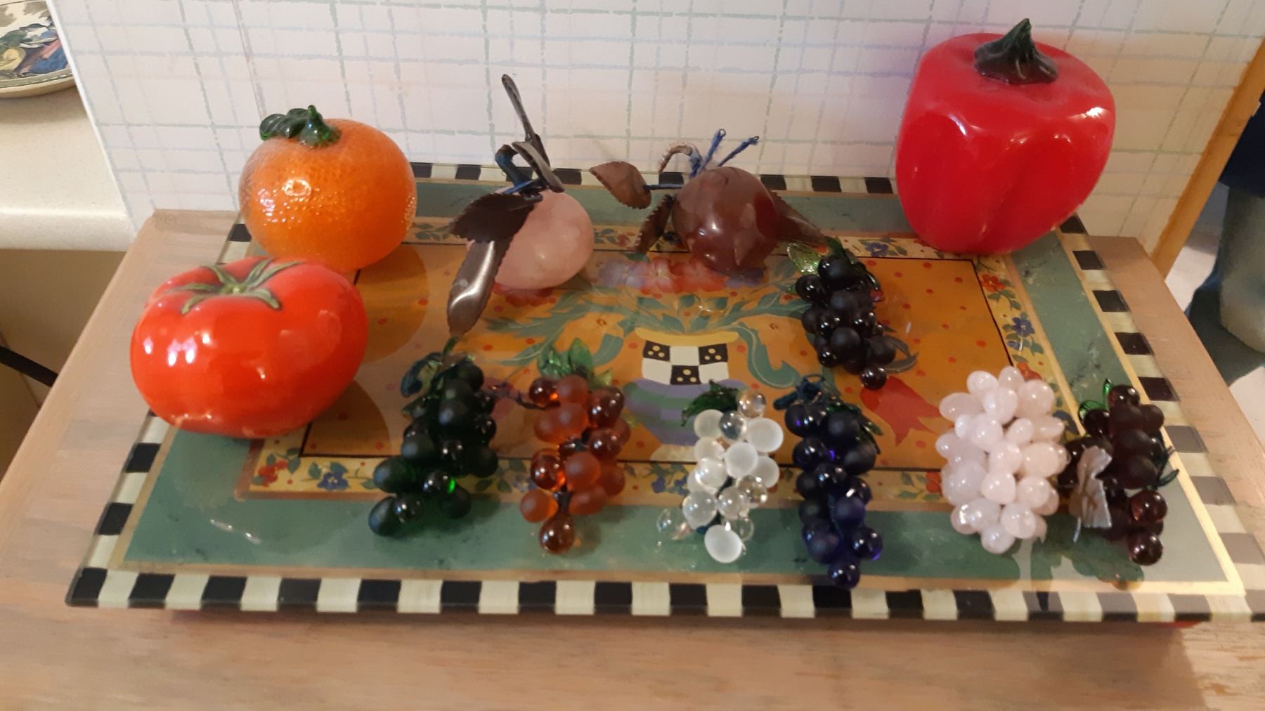 Twelve fruits and footed painted glass stand. Stand is 16x10x1.5. Bring packing materials.