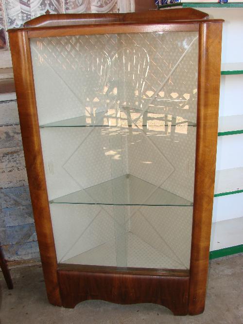 Glass front corner cabinet w/glass shelves, ecru fabric