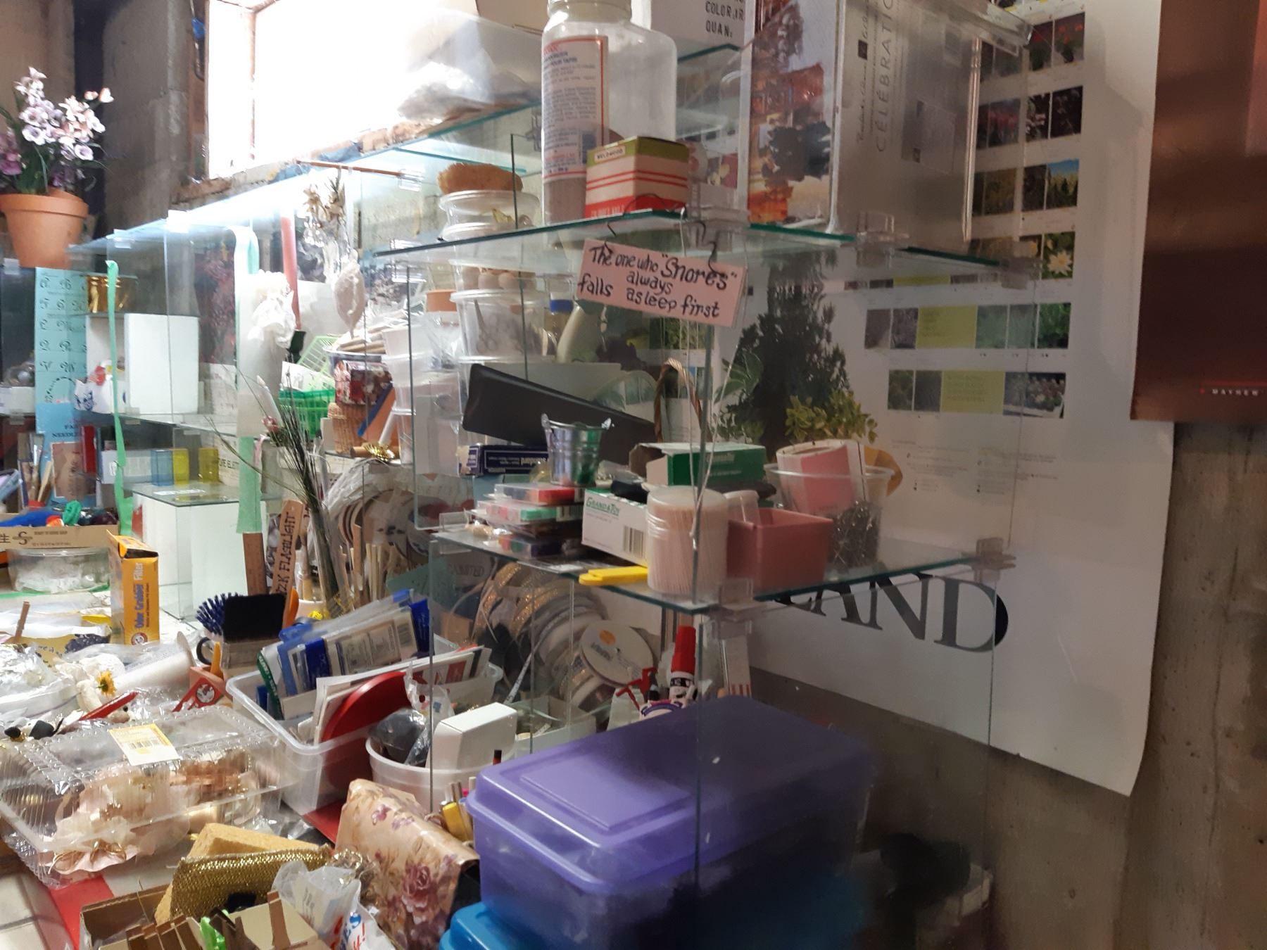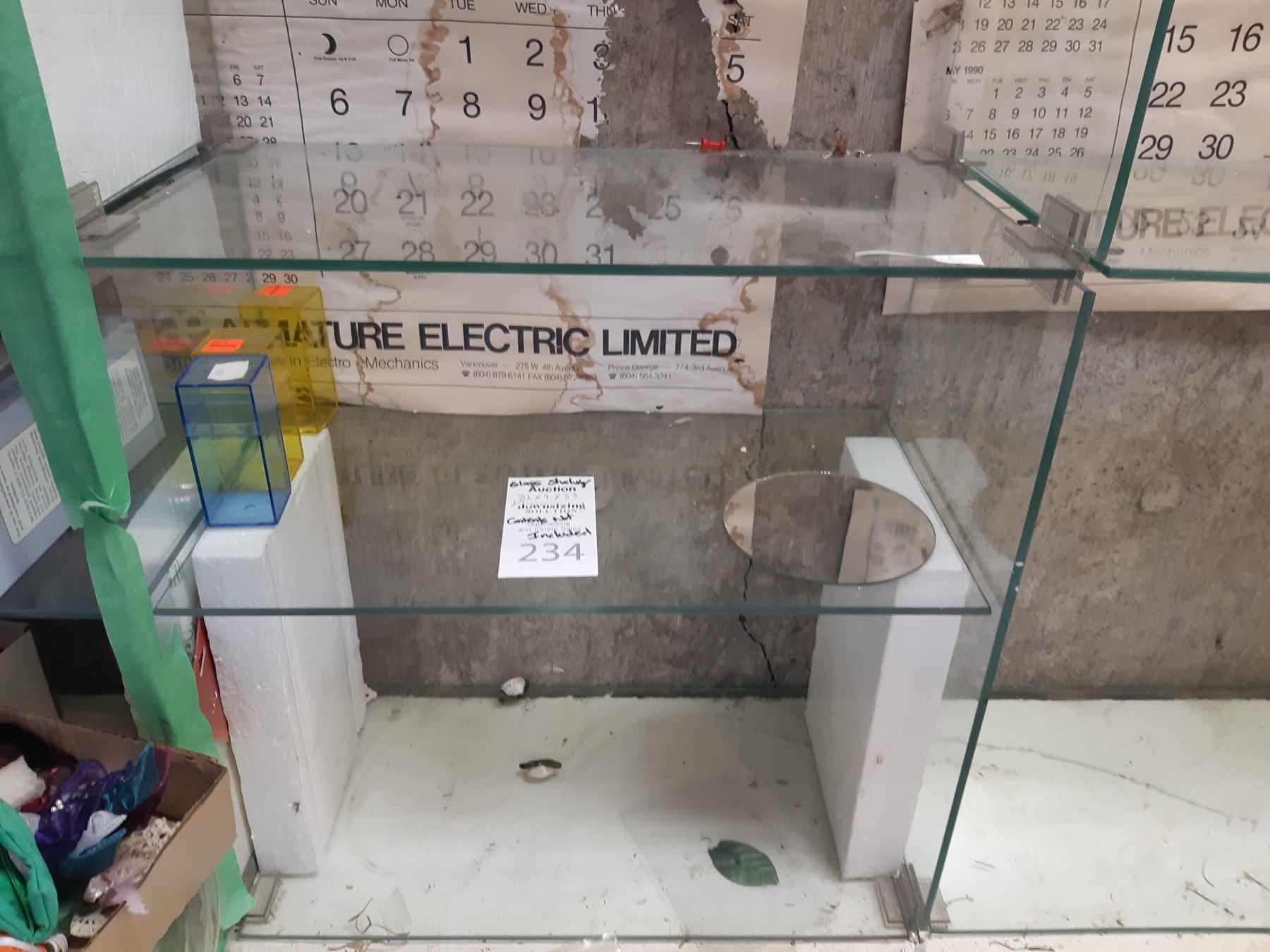 Glass shelving 82x9x33. Contents not included. Please bring packing materials. Pick up at 10 am.