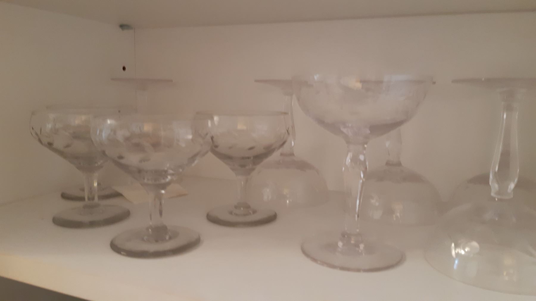 Thee shelves with variety of glassware. Tallest 8". Bring packing materials