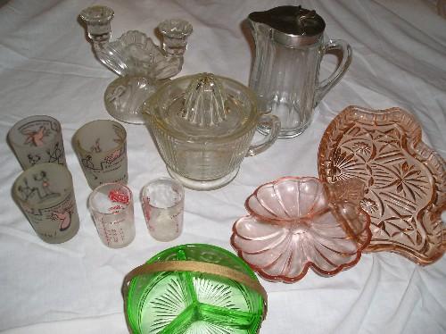 Glassware, Cream pitcher, juicer, 5 jiggers, pink depression, candlestick (believed to be Herringbone & Fris), green divided dish.