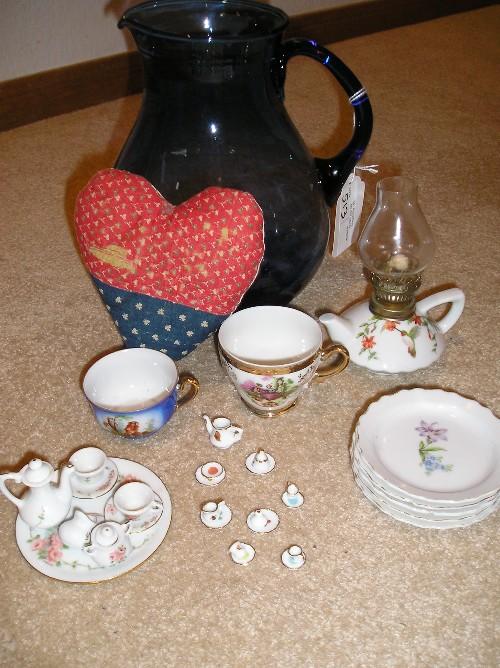 Very miniature teaset, small plates, two teacups, mini lantern, blue water pitcher and country stuffed heart.