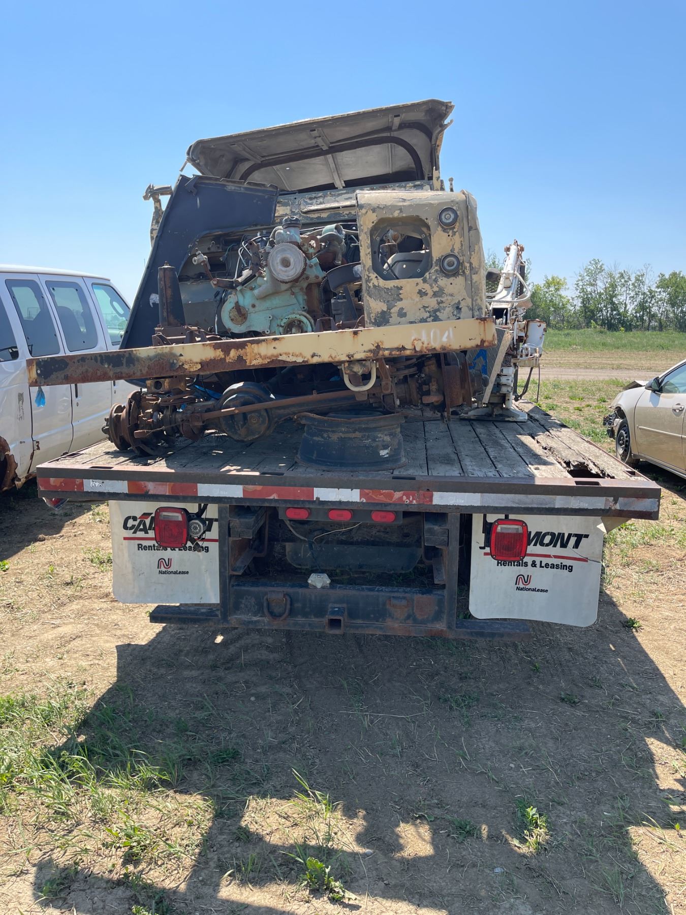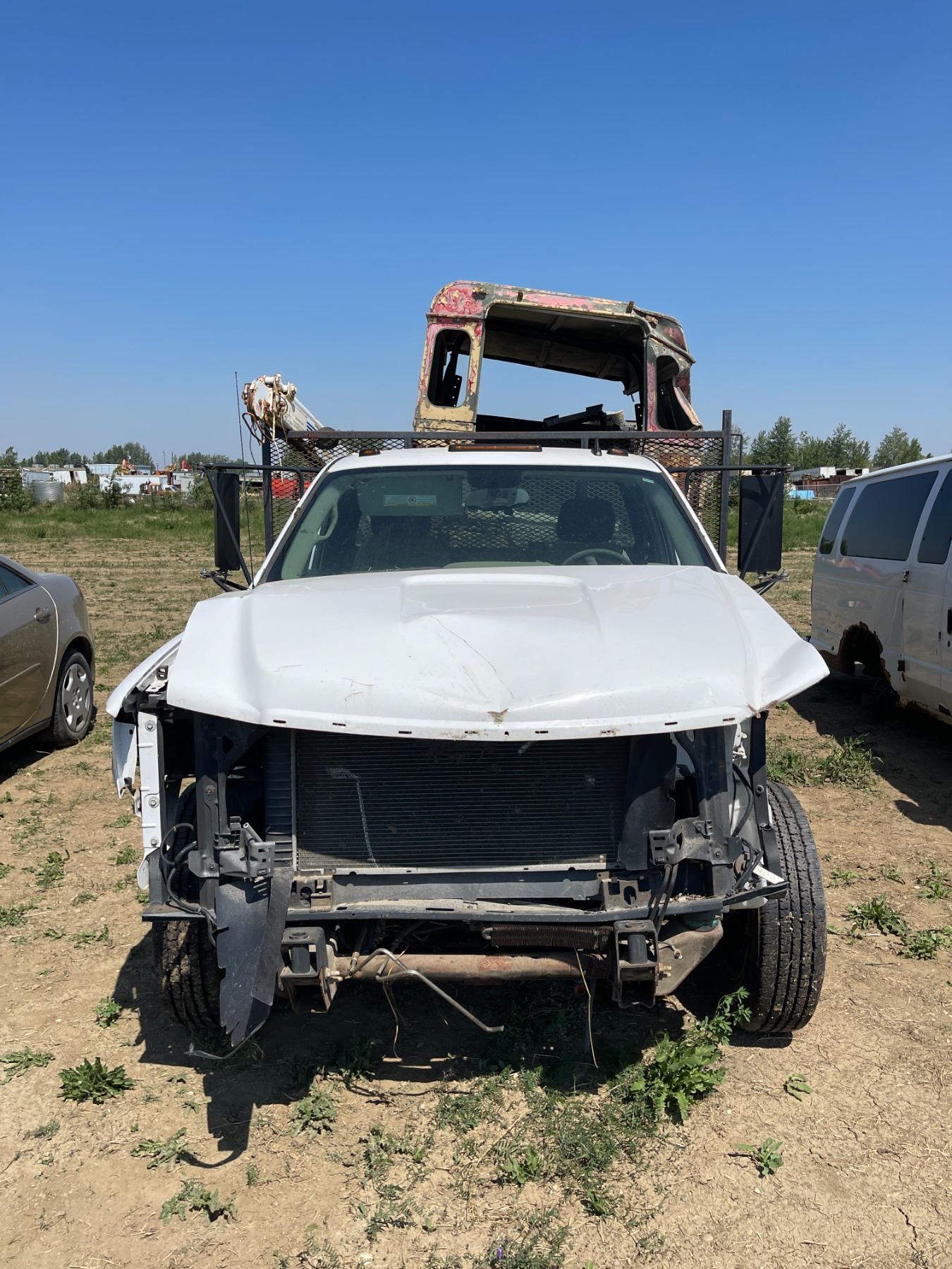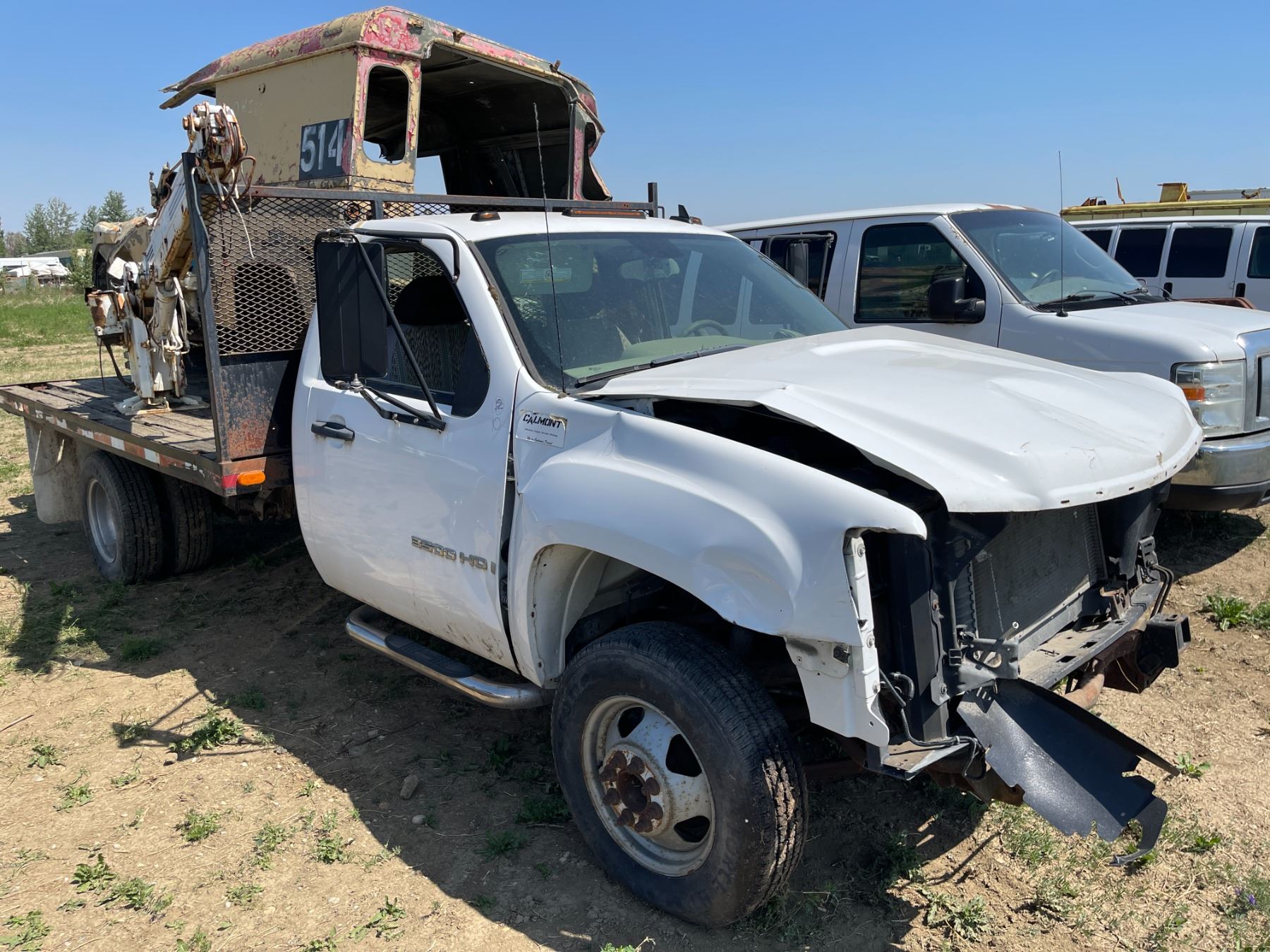 Gmc 3500 flat deck truck, trailer hitch. C/w military jeep body , crane, misc. VIN 1GDJC34KX8E185340