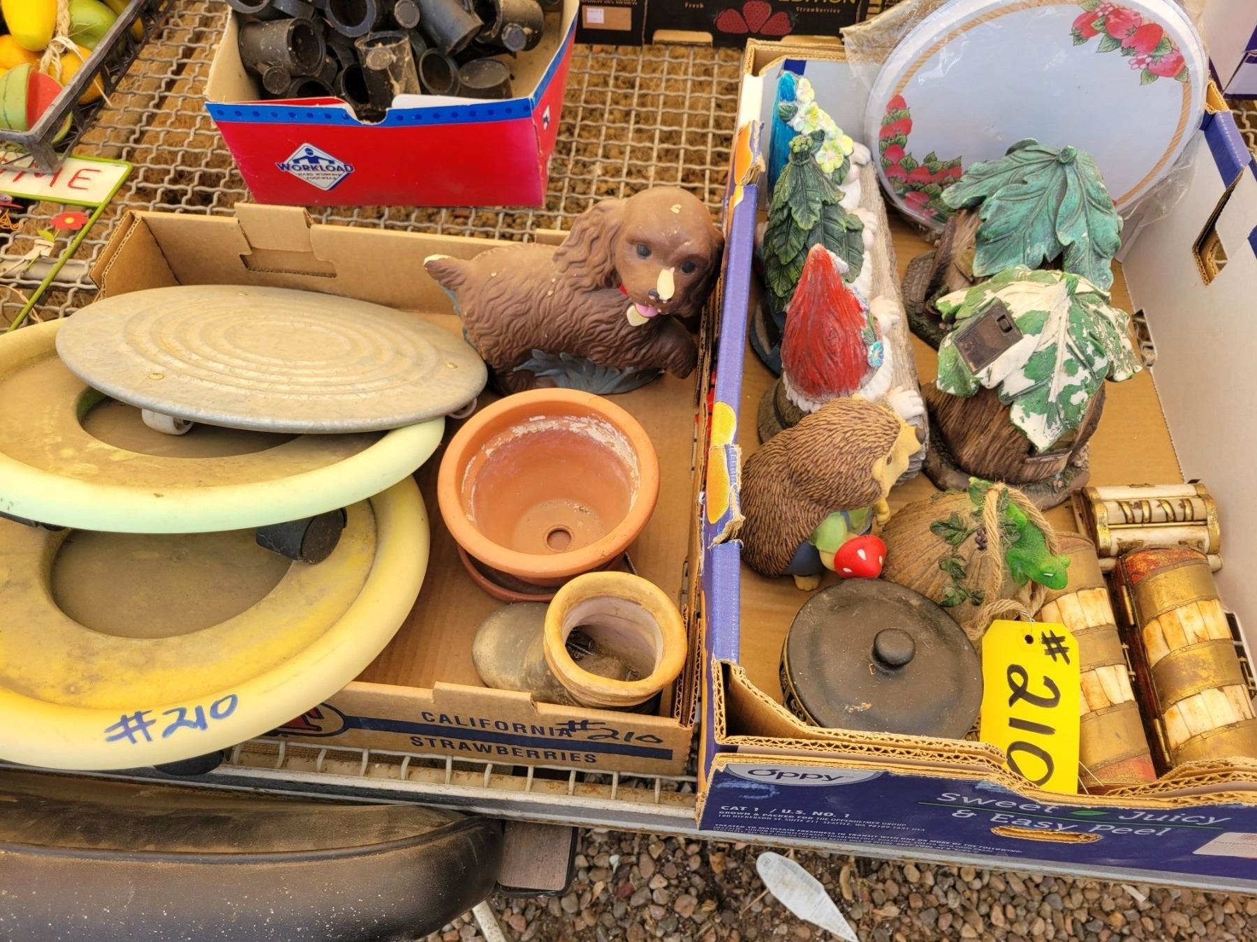 Gnome figurines, bird feeders, jewelry box, plant movers X 3