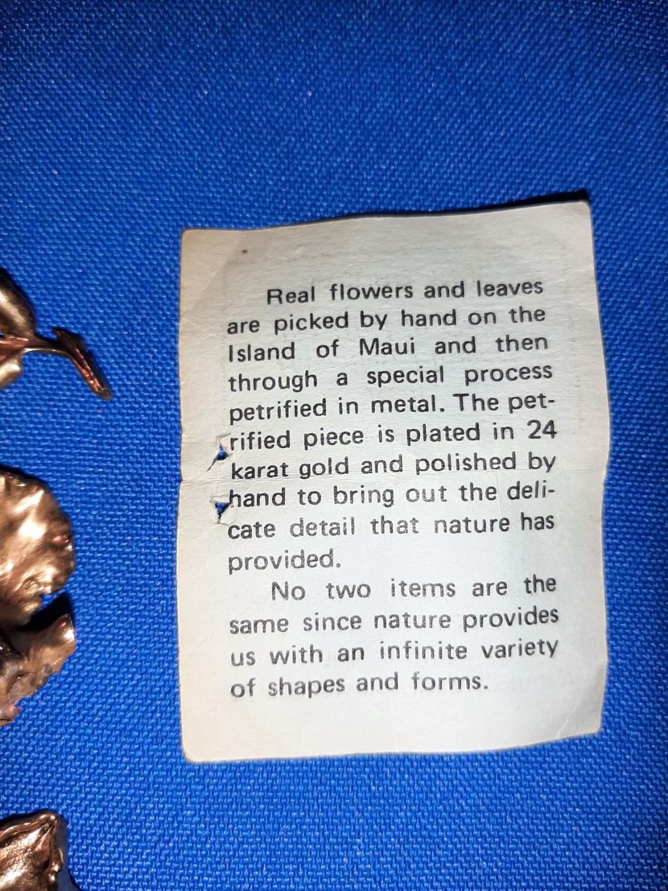Gold tooth cap, karat unknown. Approximately 2 grams. 24k gold plated leaves comes with paper description from maker.Pickup at 9 am