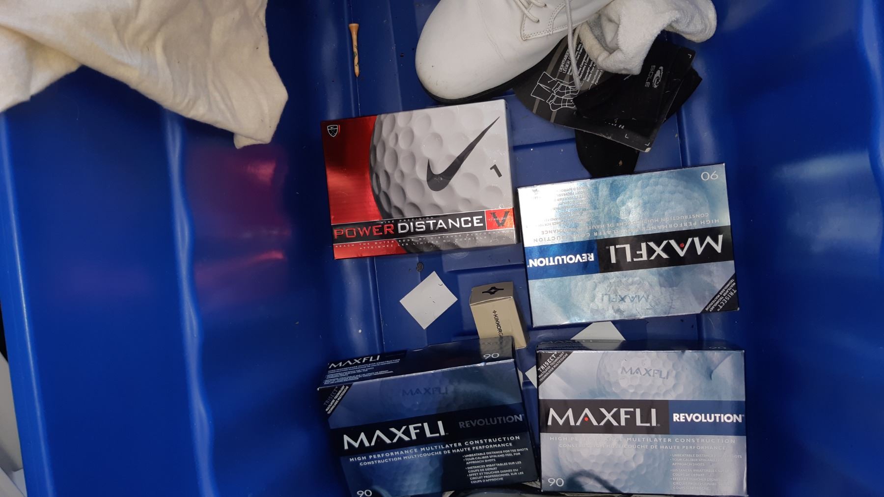 Two pairs of men's golf shoes size 11.5. Four boxes Maxfli golf balls, XXL Sunderland vest and Elevate golf jacket. Golf gift basket. Pick up 9-10