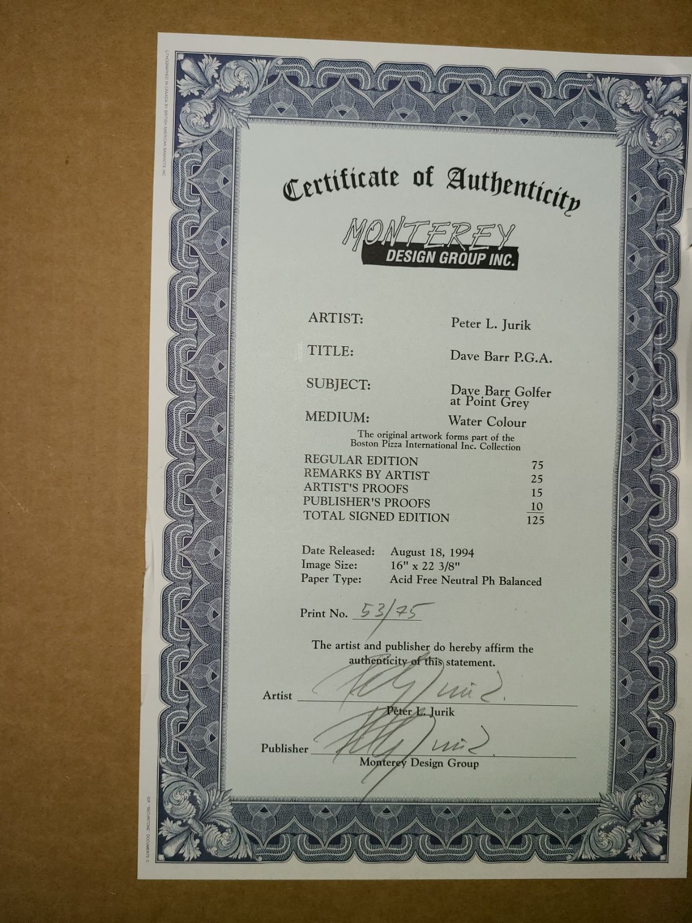 Certificate of authenticity for Dave Bar. Jack Nicklaus and more. Pickup at 9am