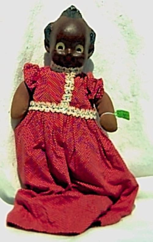 23" Martianna, black molded hair, moveable large eyes/slide, head comp or paper machette, all cloth body, arms brown, body white, gauzy muslin slip made on her.
