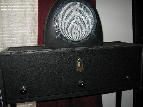 The chassis in this set is a re-labeled Radiola 17. The console cabinet is a rare Art Deco design and has its original matching speaker. This is a rare set that has been restored in crinkle finish black. There is an RCA equivalent that is much more common and is finished the same way except for its cosmetic trim. It has a complete set of tubes and the speaker driver is good.