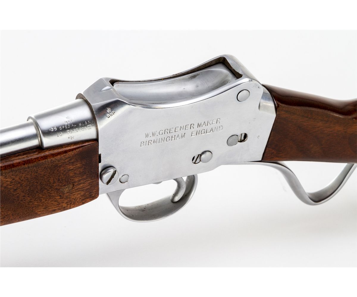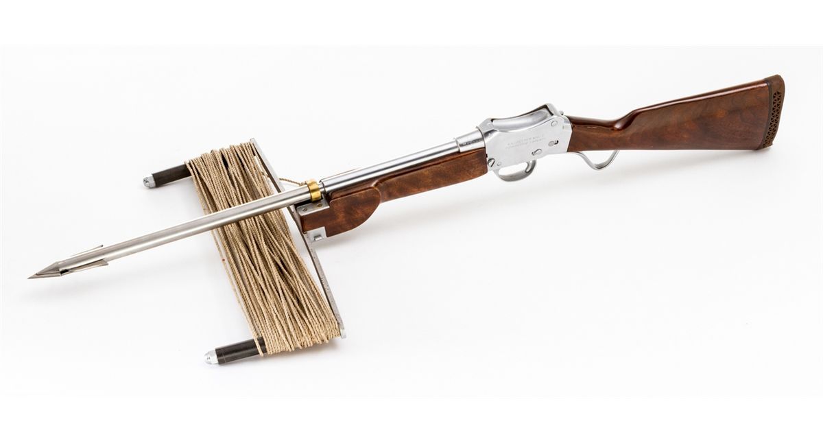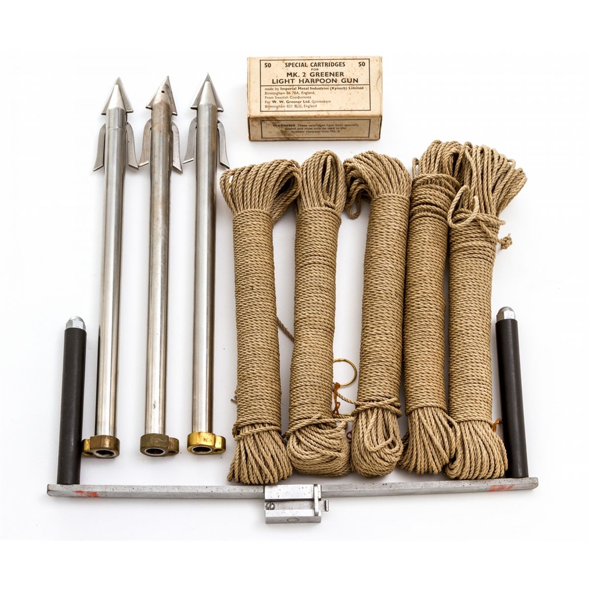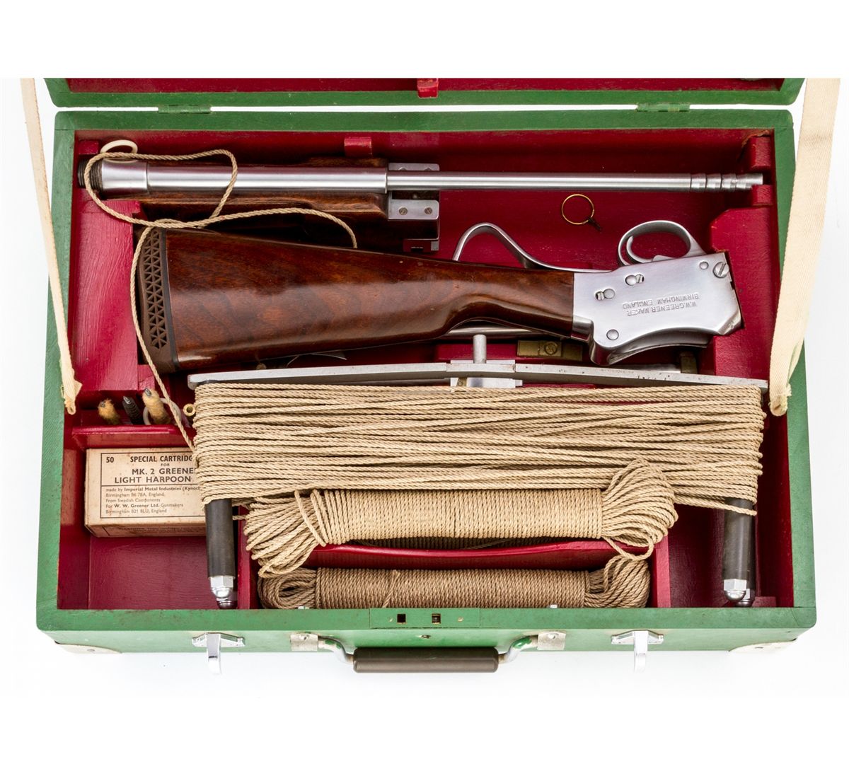 Greener Light Model Harpoon Gun, in case, #H72124, 20'' barrel, Martini action marked ''Greener's Light Harpoon Gun MK 2'' to right side of frame; left side marked ''W.W. Greener, Maker/Birmingham, England''. Includes three lances, cable spools, special cartridges, cleaning rod, brushes, appearing complete with all accessories. Condition is excellent showing minor nicks to stock and slight deformation to rubber butt pad from storage, with excellent bore. Exterior of case with very minor scuffs. Identical to the type used in the movie ''Jaws''. Est.: $750-$1,000. (Ernest A. Bryant III estate)