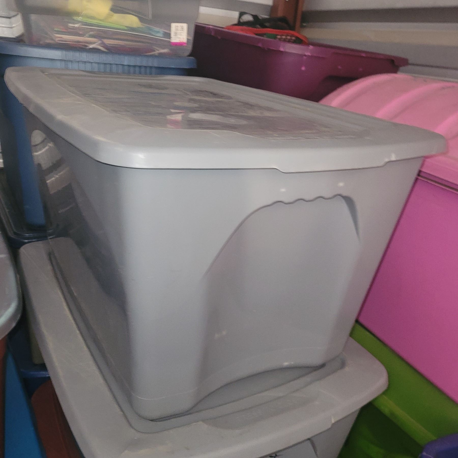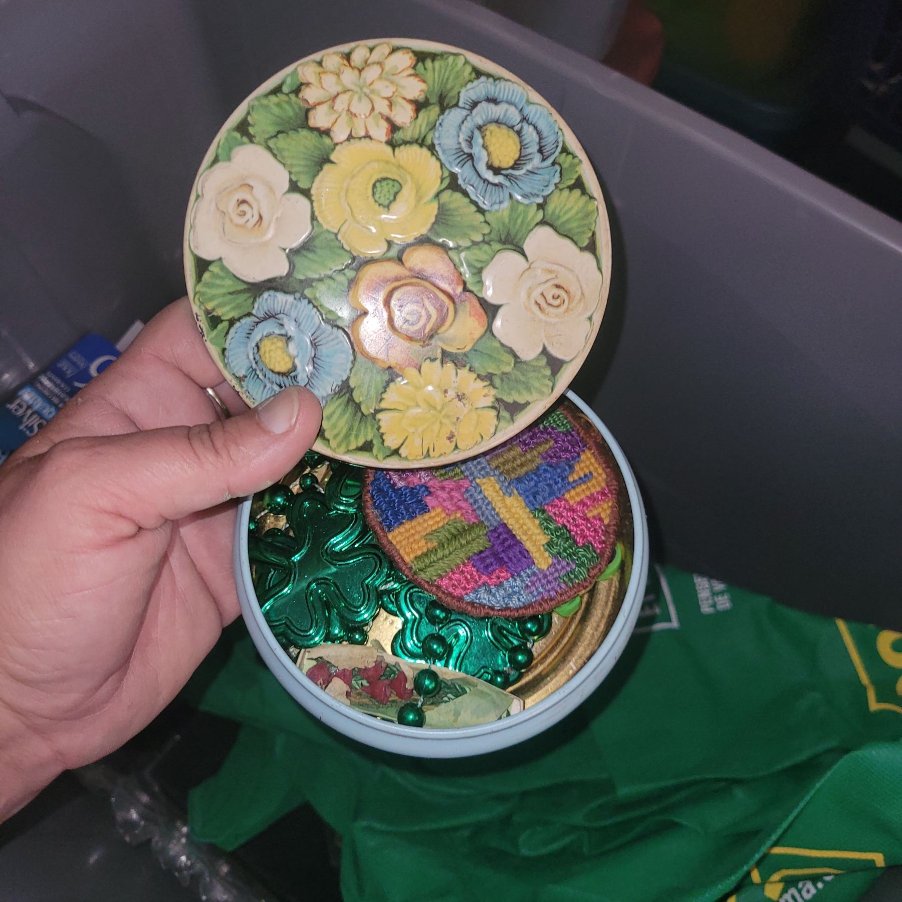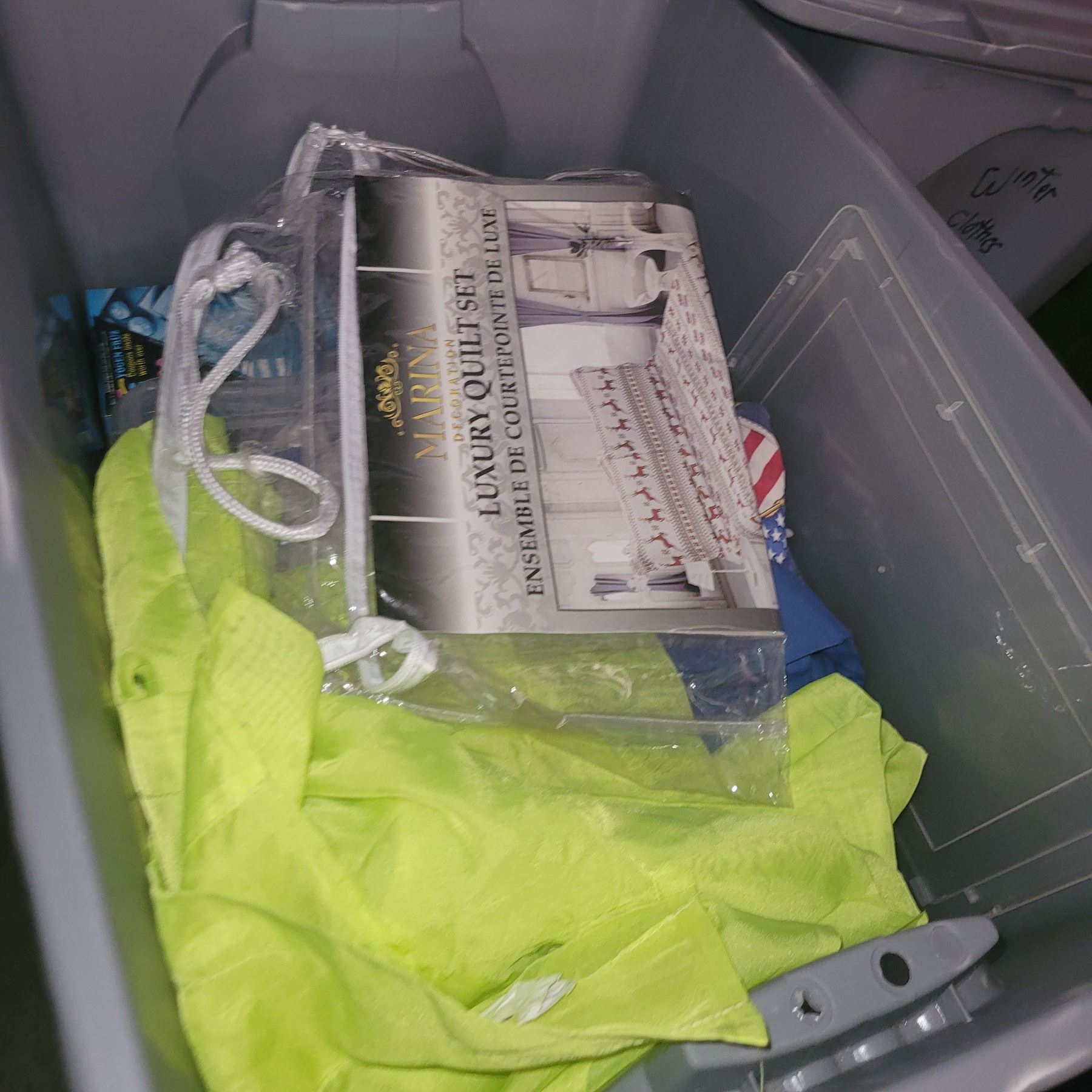 Grey Tote w/ Contents - Quilt, Collectible Tin, Vintage Tape Player, Rewinder +